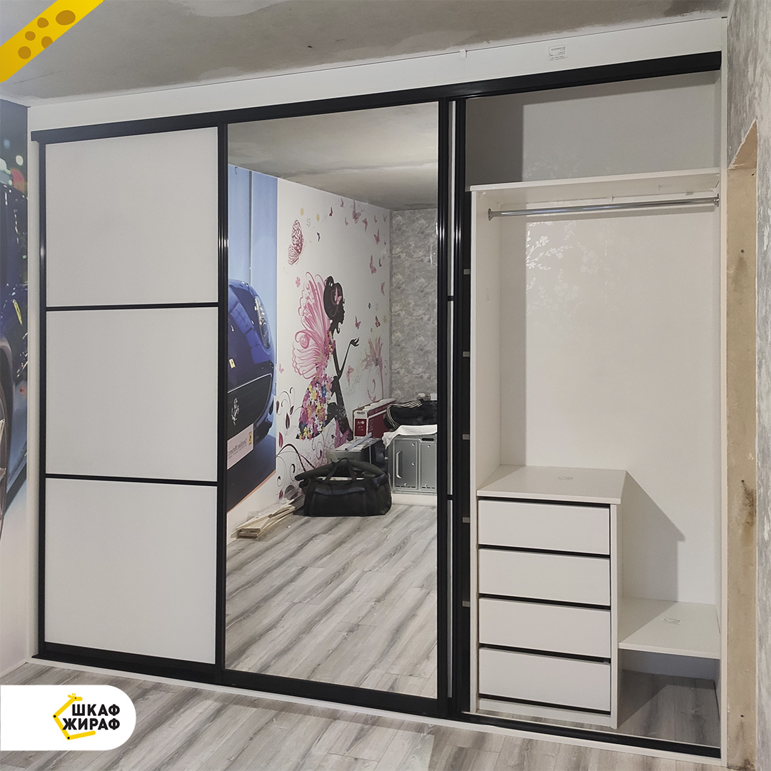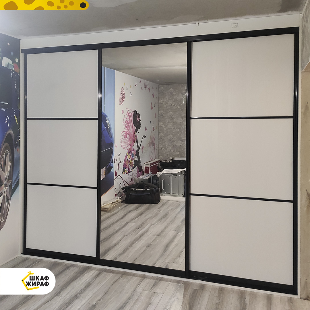 Встроенный трехдверный шкаф-купе с зеркалом и белой ДСП с разделениями в черном профиле Modus. Вверху — короб для крепления натяжного потолка.