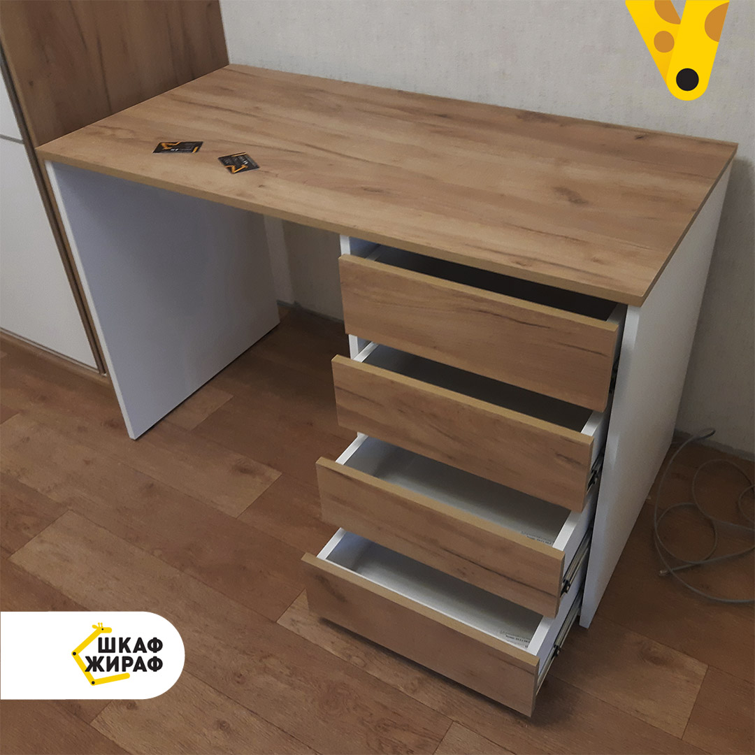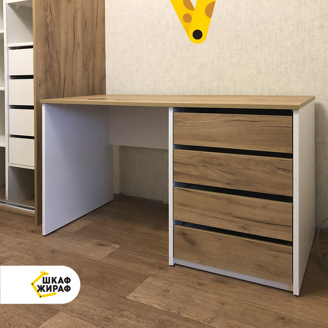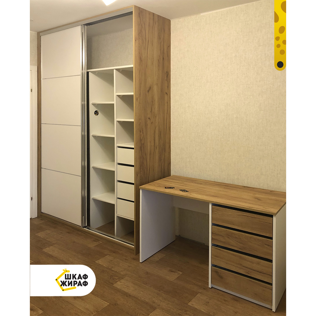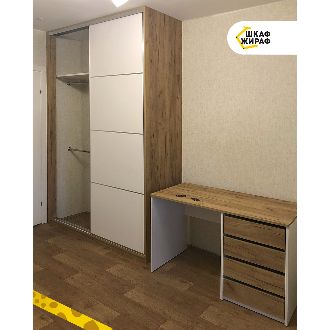 Шкаф-купе и письменный стол в сочетании двух декоров ДСП: древесной структуры дуба и однотонного белого.