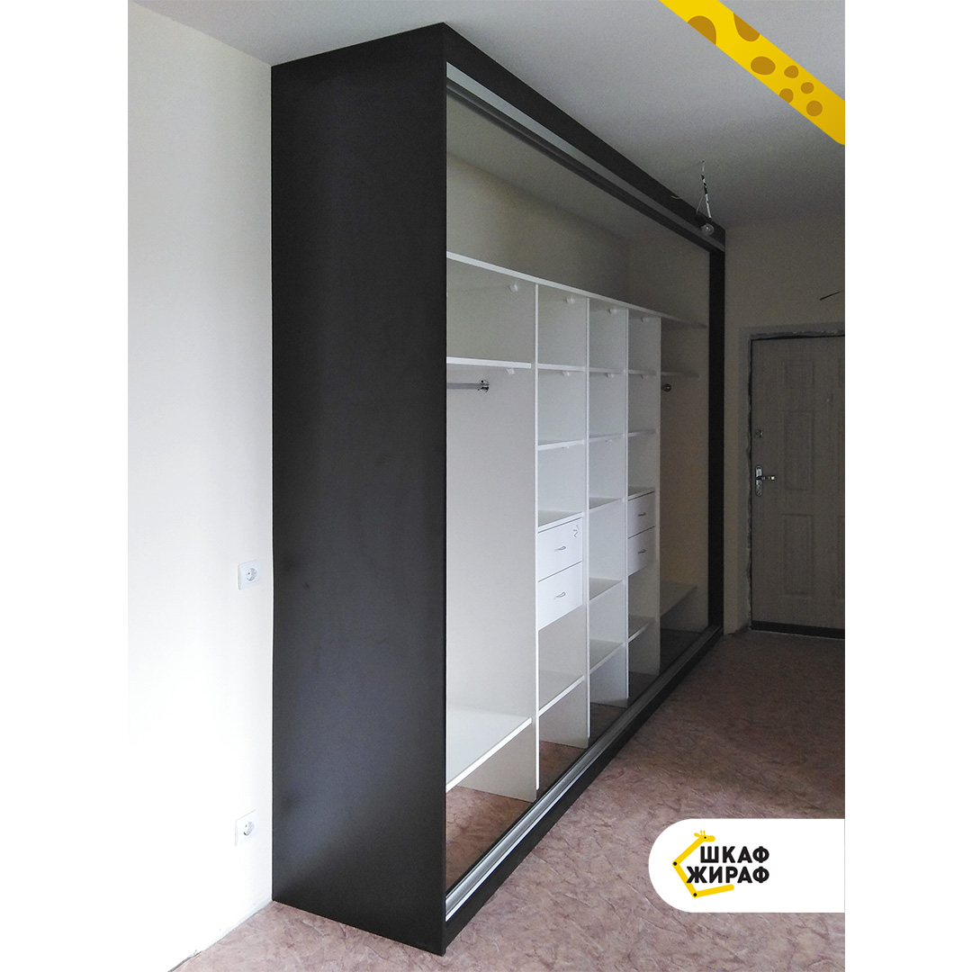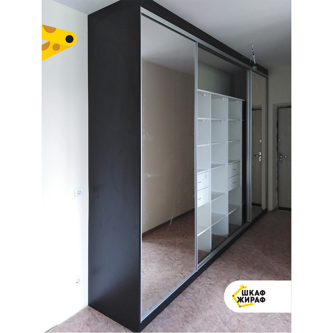 Длинный вместительный 3,5-метровый шкаф-купе в узкой прихожей. Фасад из черной ДСП с разделениями и зеркала в узком серебряном профиле Modus.