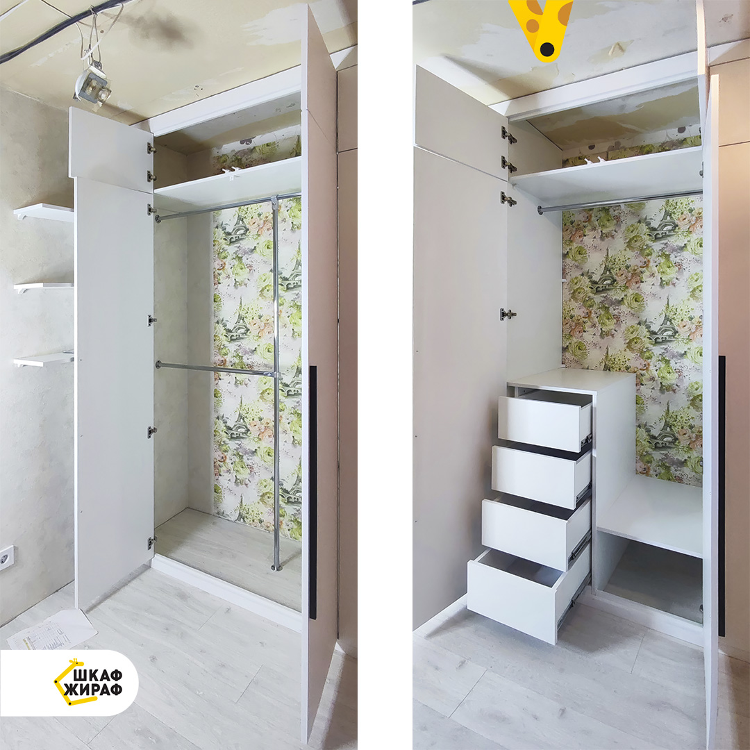 По индивидуальному проекту с полками, штангами для одежды и выдвижными ящиками на шариковых направляющих полного выдвижения.