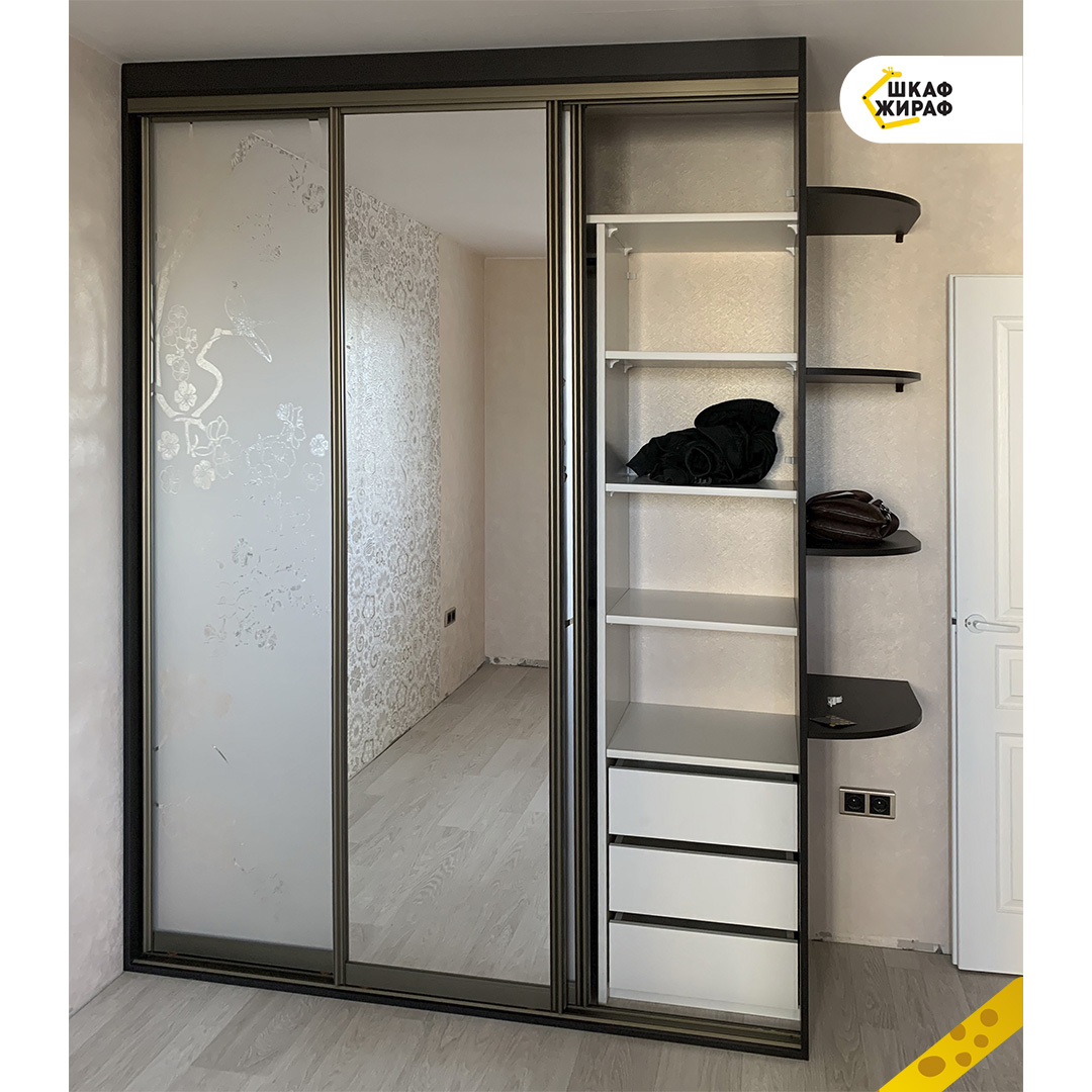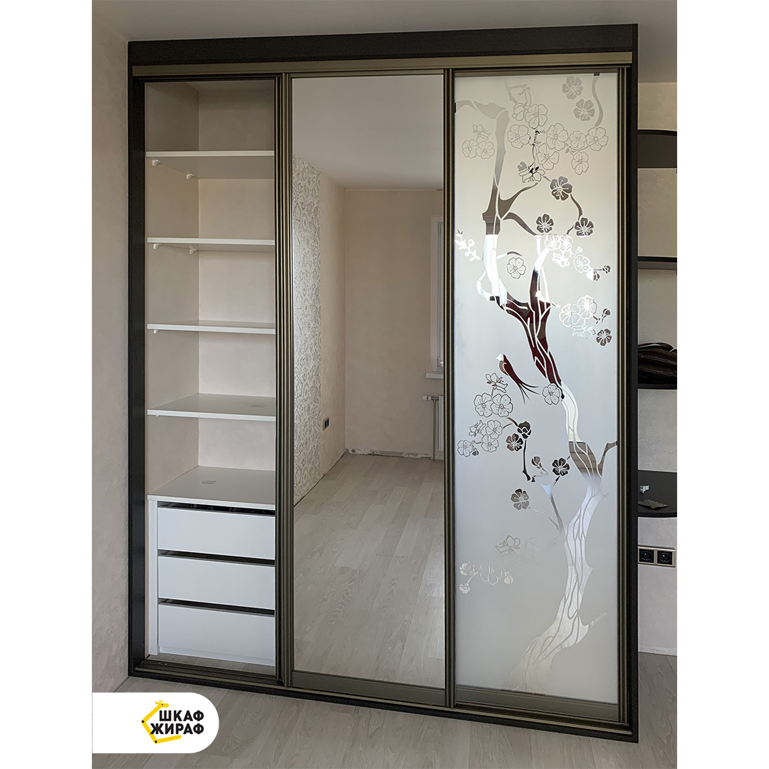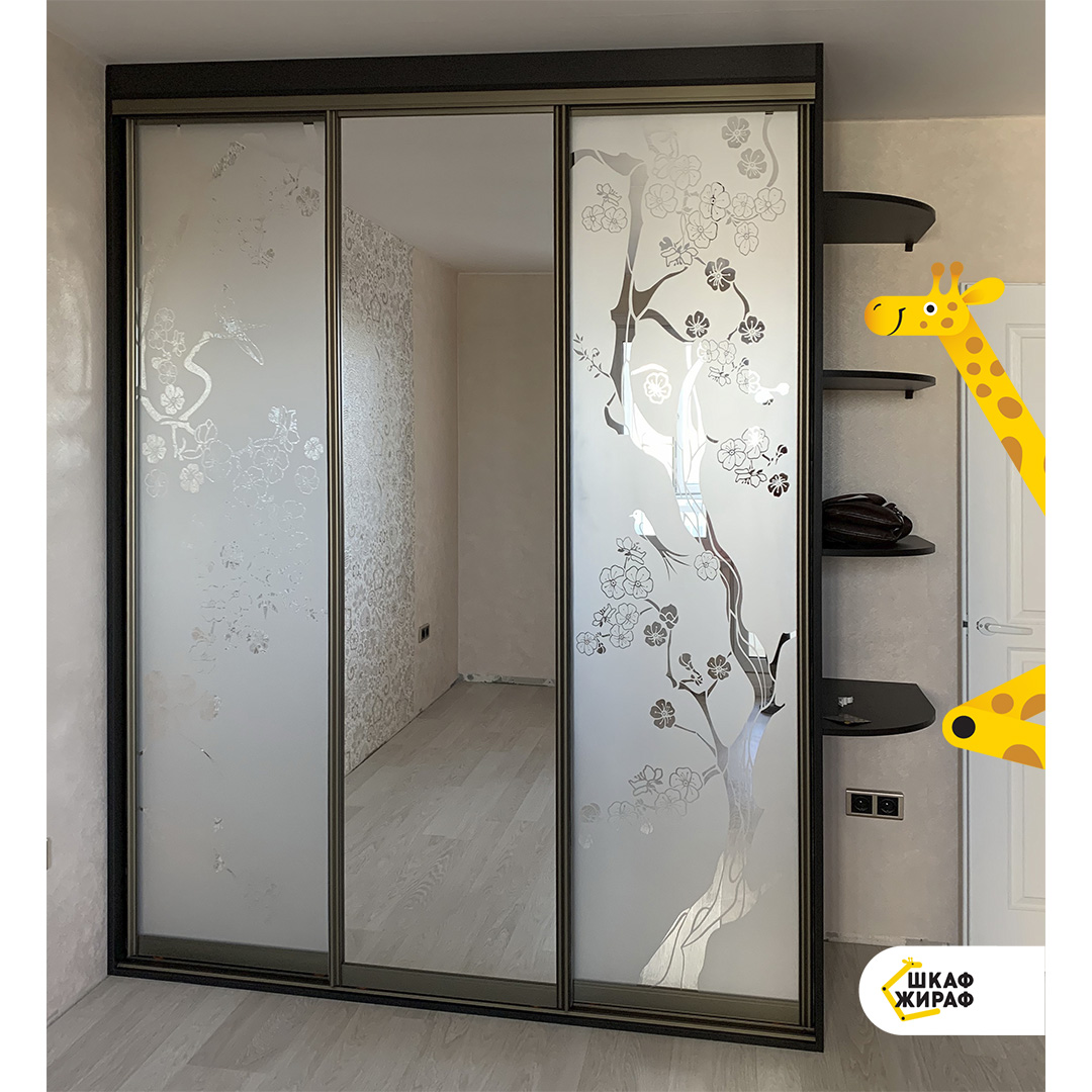 Трехдверный шкаф-купе с пескоструйным рисунком на зеркале, радиусными полками и коробом под натяжной потолок.