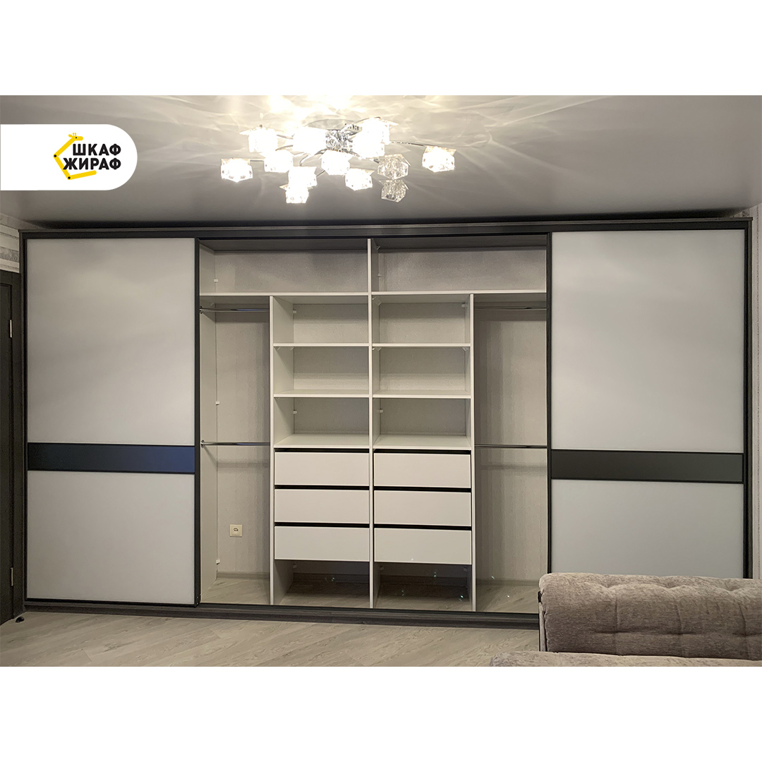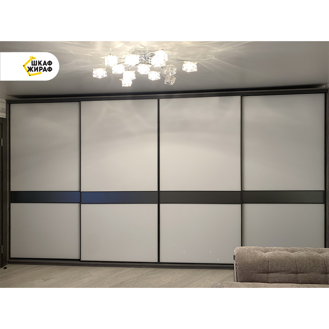 Широкий (4,3 метра❗) встроенный шкаф-купе с комбинированными дверьми из ультрабелого и графитового мателака в узком профиле Modus титанового цвета, а также теплый отзыв от нашей заказчицы Людмилы, за что ей огромное спасибо!