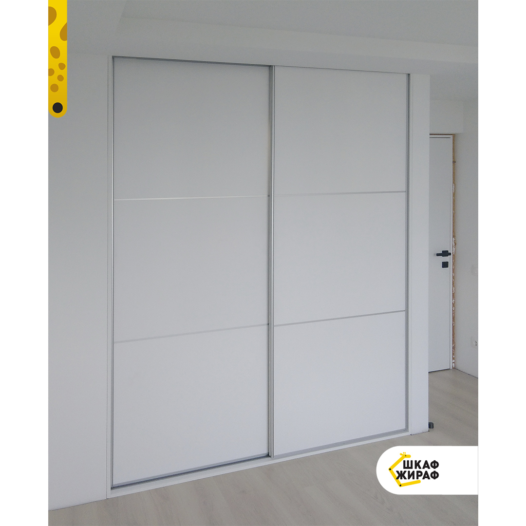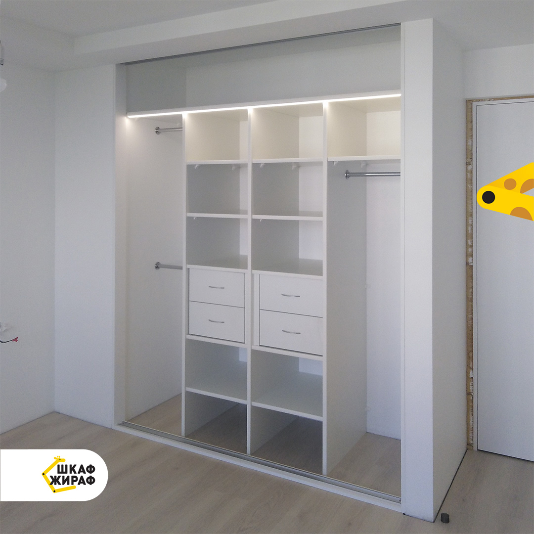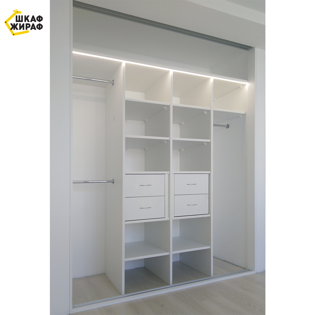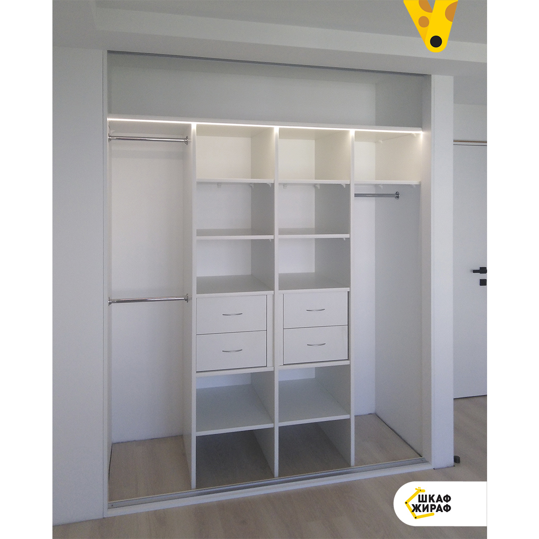 Шкаф-купе с дверьми из белой лДСП с разделениями в узком профиле Modus. Внутреннее наполнение шкафа освещает светодиодная лента.