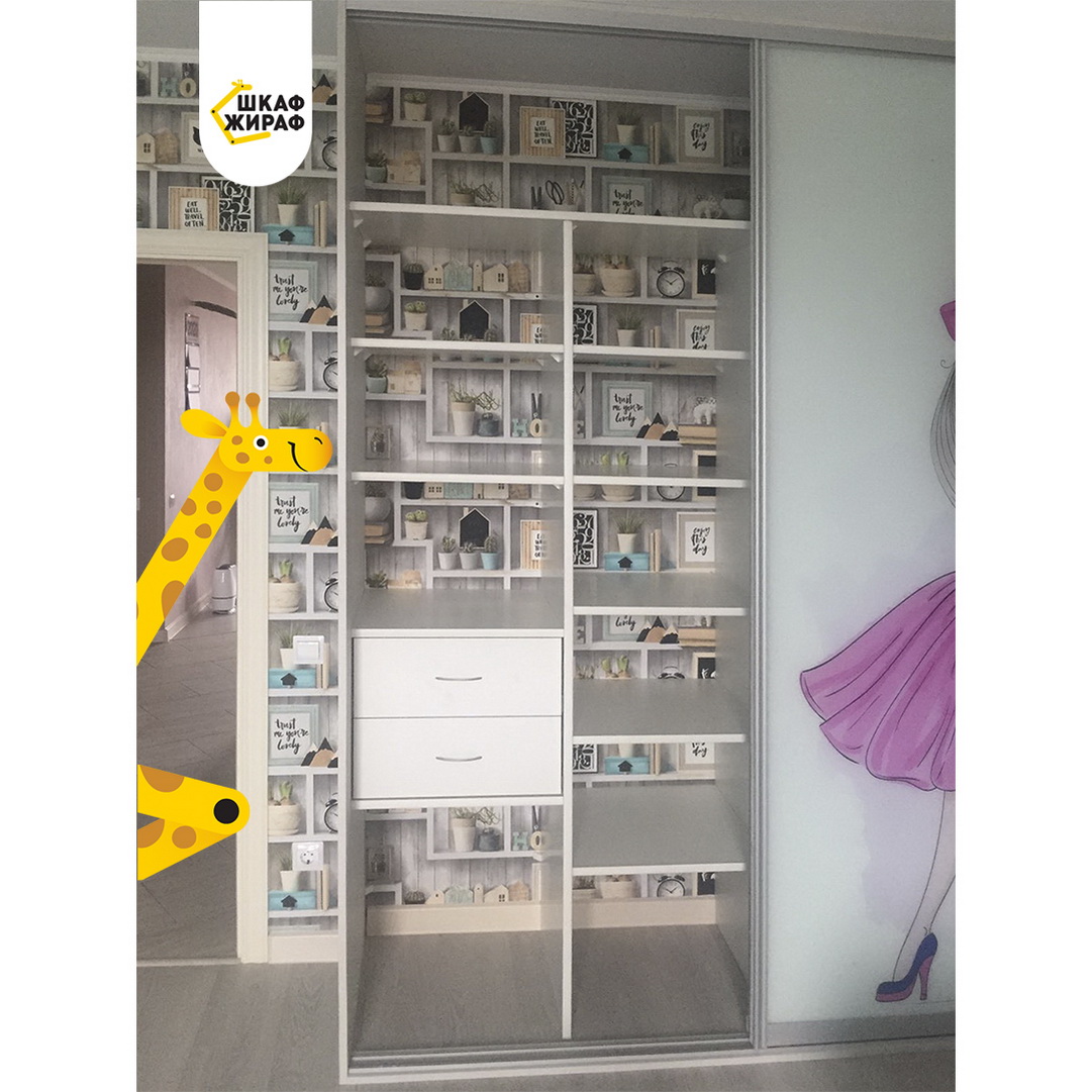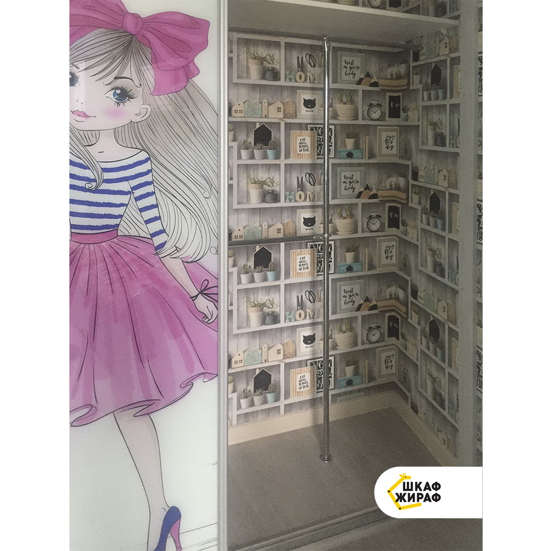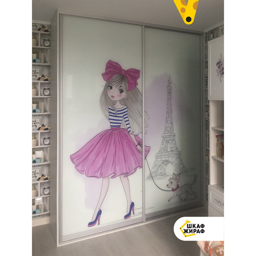Шкаф-купе с фотопечатью, создающей атмосферу романтичного Парижа в детской комнате девочки. Рисунок нанесен на стекло методом ультафиолетовой фотопечати высокой четкости. В целях безопасности внутреннюю сторону каждой двери мы проклеиваем специальной армирующей пленкой, которая придает прочность стеклу.