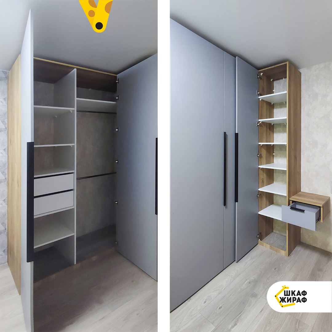 По индивидуальному проекту со штангами для одежды, полками и выдвижными ящиками на шариковых направляющих полного выдвижения.