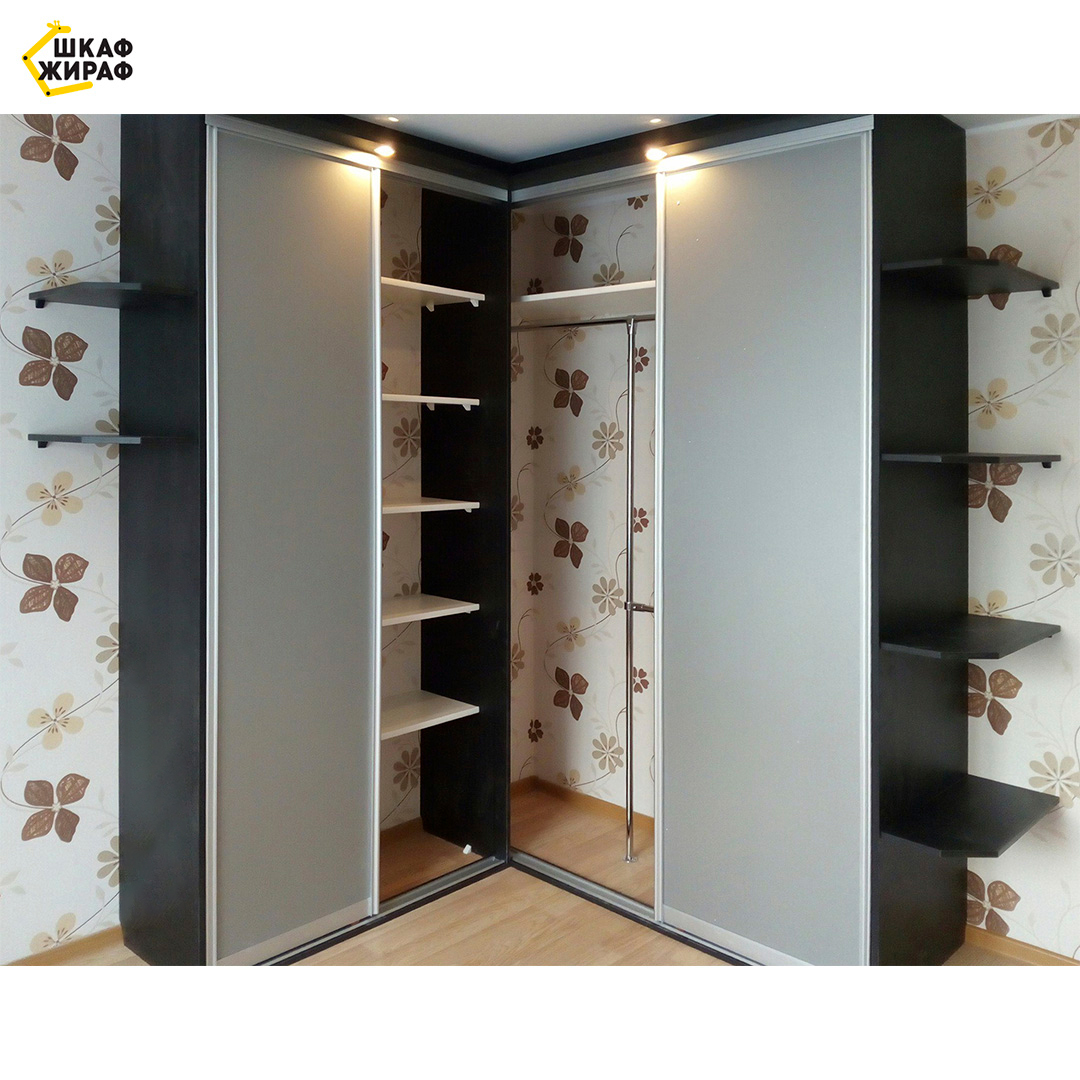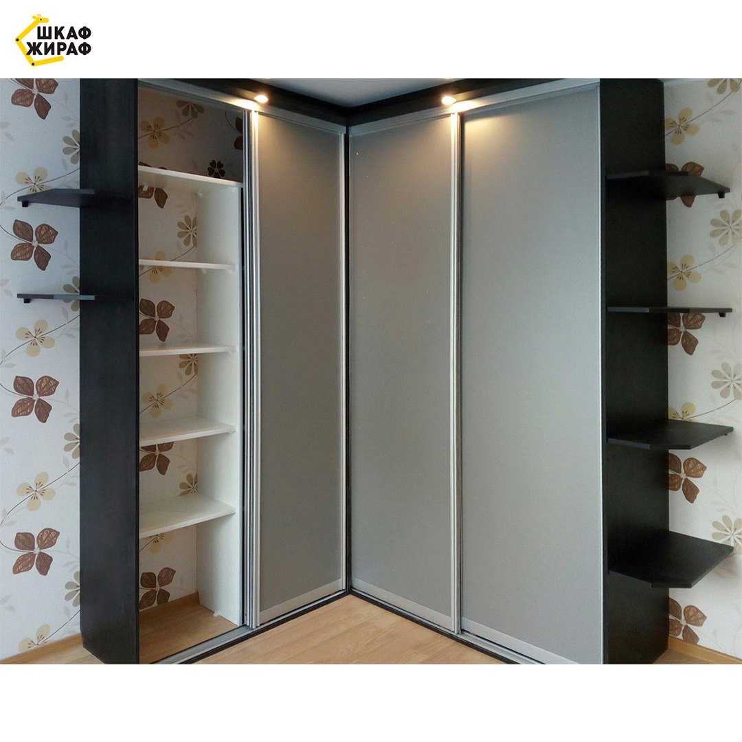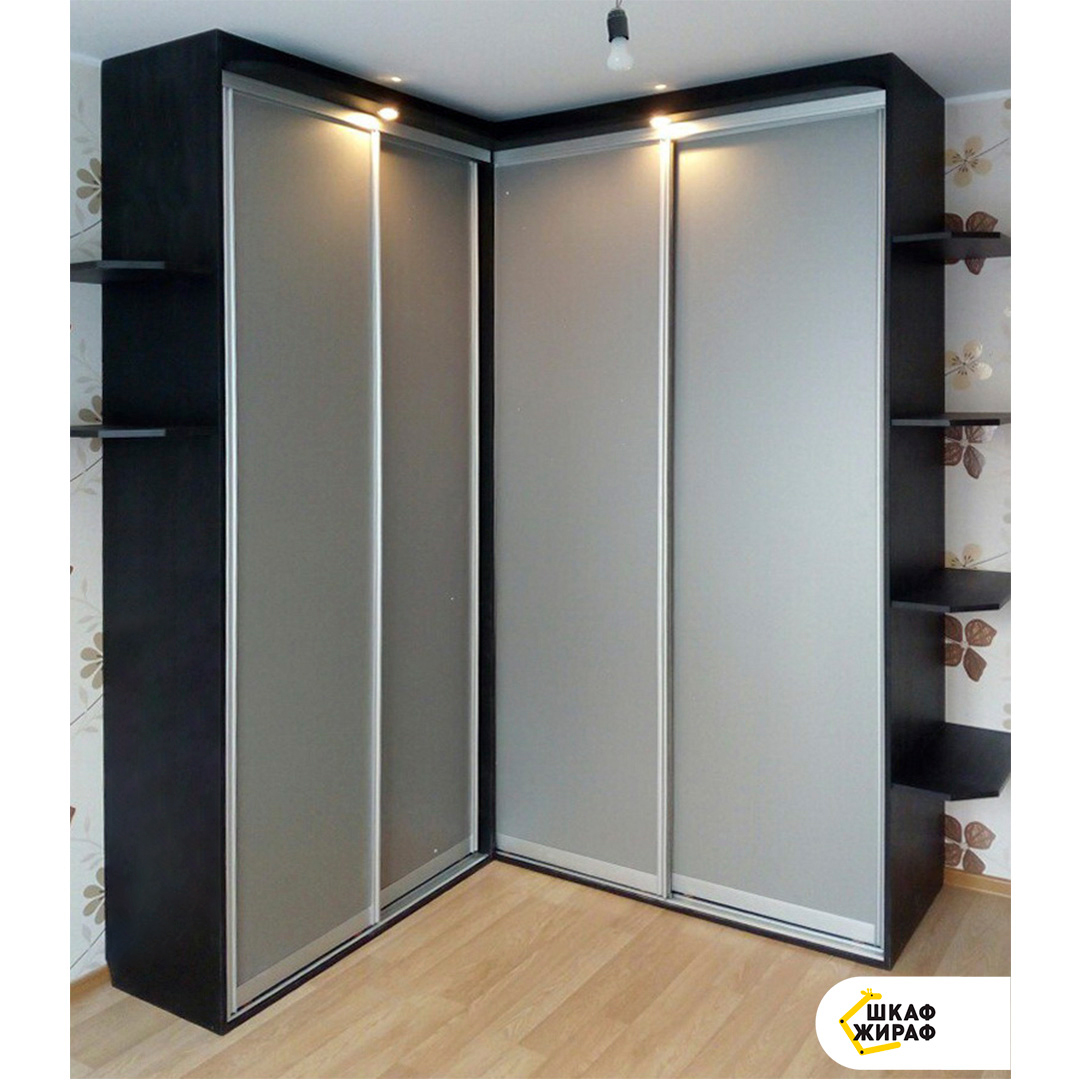 Угловой Г-образный шкаф-купе с подсветкой, открытыми полками и фасадом из лДСП цвета металлик.