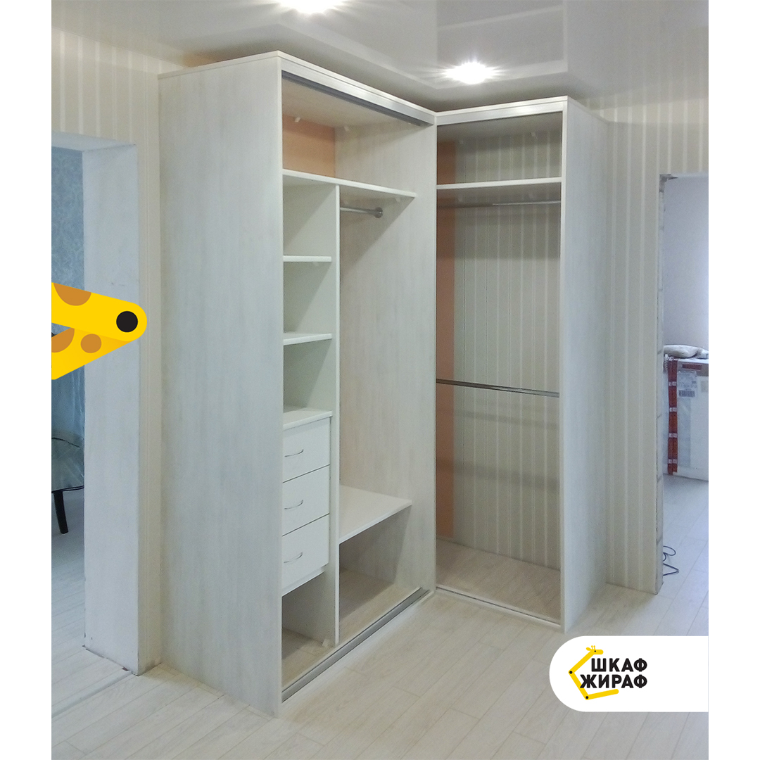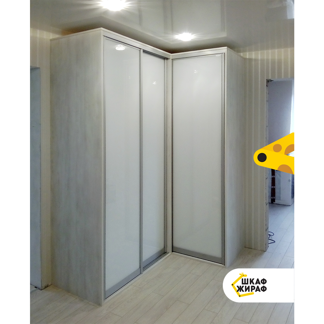 Угловой шкаф-купе с фасадом из белого лакобеля.