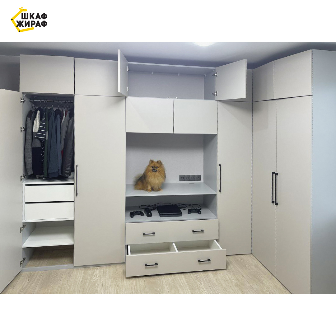 Угловой распашной шкаф с фасадами из ДСП. Маленький пушистый заказчик все проверил и принял работу. В такой большой шкаф можно сложить не только его игрушки, но и вещи других членов семьи. Надеемся, что он разрешит.