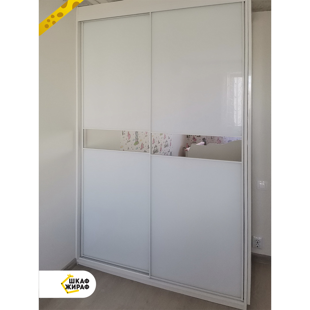 Белый полувстроенный шкаф с зеркальной боковой стенкой в Z-профиле и комбинированными дверьми из ультрабелого лакобеля и зеркала в узком белом профиле Modus.