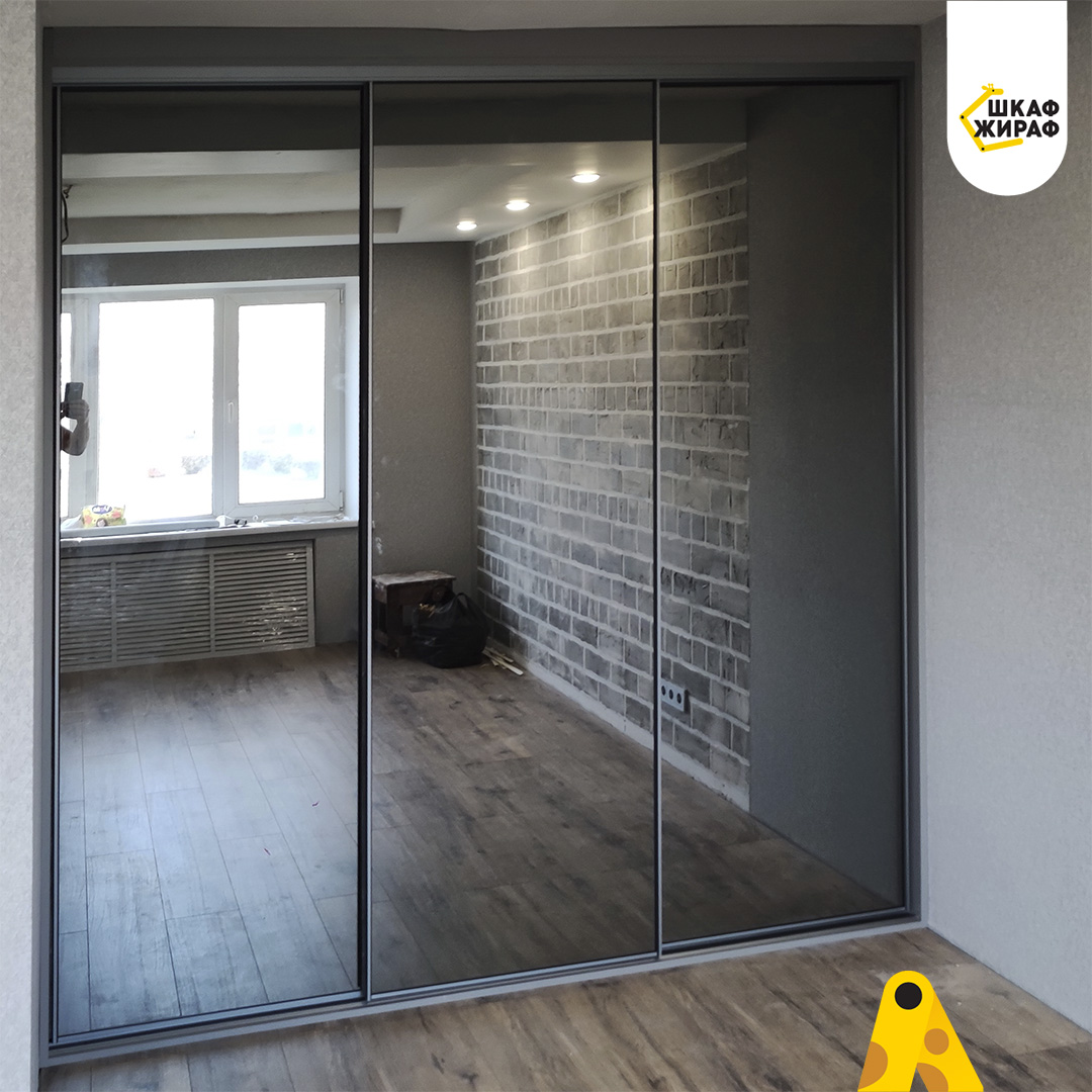Трехдверный встроенный шкаф-купе с дверьми из графитового зеркала в узком профиле Modus тоже графитового цвета.
