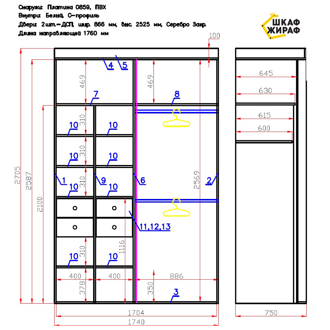 Стандартное и индивидуальное наполнение шкафов - полки, штанги, выдвижные ящики, корзины, пантографы и др. Можно выбрать любую комплектацию.
