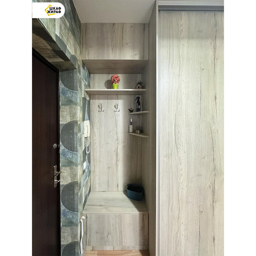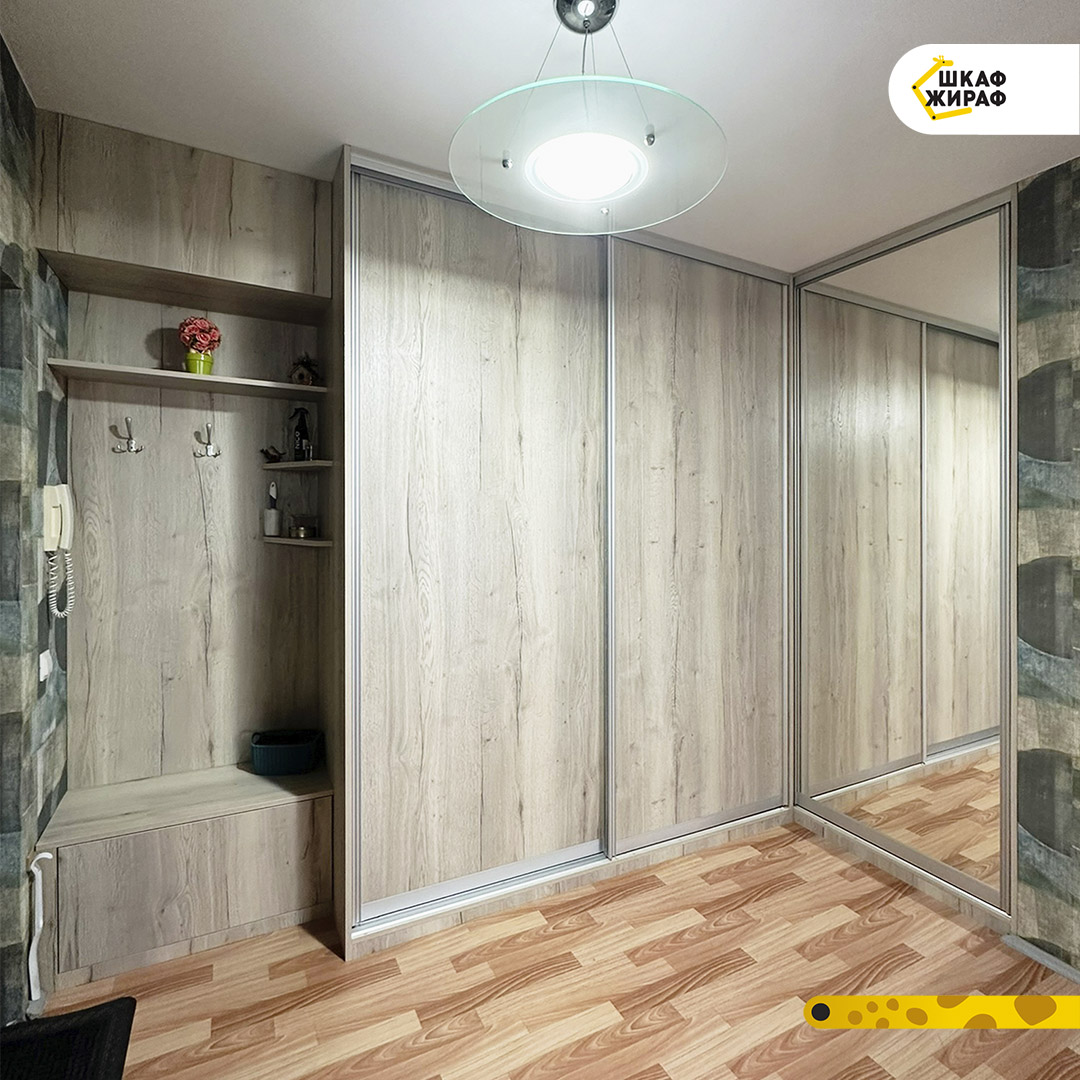 Угловой шкаф-купе в комплексе с прихожей: тумбой для обуви, полкой, антесолью и крючками для одежды.