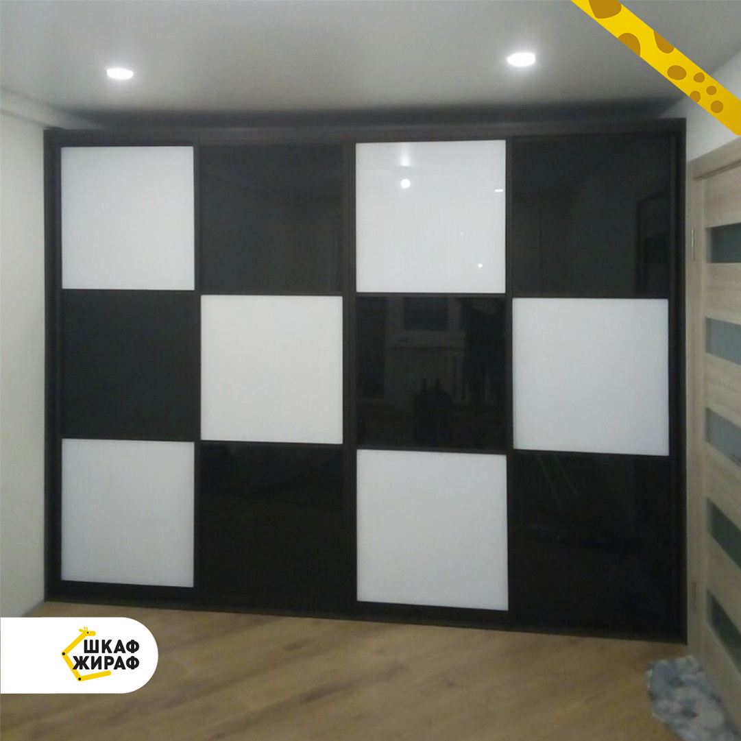 Четырехдверный встроенный шкаф-купе с крышей и с комбинированными дверьми в виде шахматной клетки из черного и белого лакобеля.