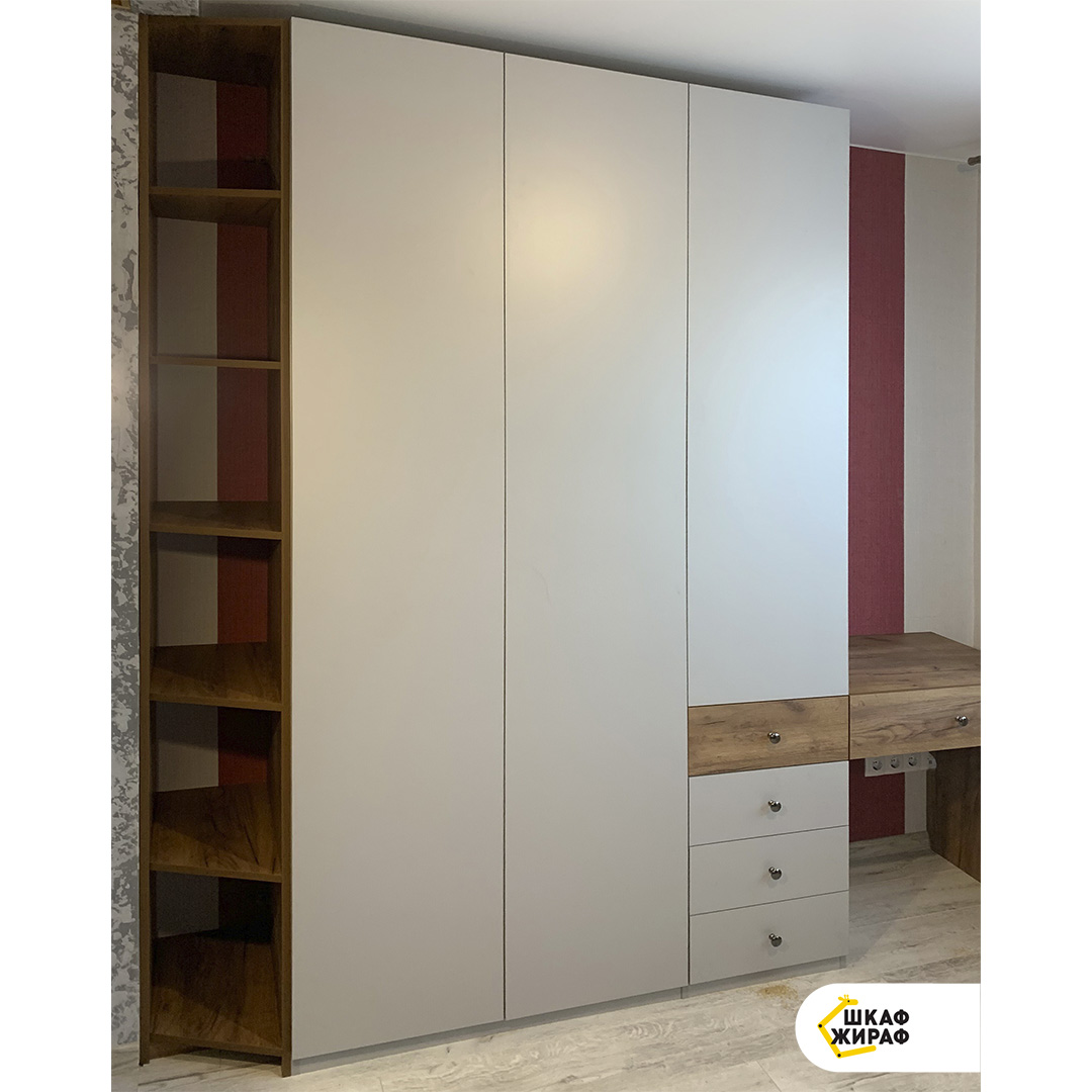 Оригинальный шкаф по индивидуальному проекту прекрасно вписался в интерьер уютной спальни. Наши клиенты сами придумали основную концепцию с распашными фасадами, встроенным комодом, открытыми полками и туалетным столиком, а мы помогли воплотить проект в жизнь.