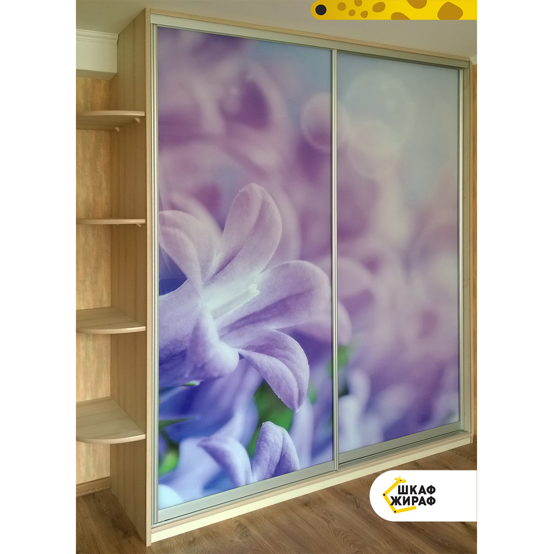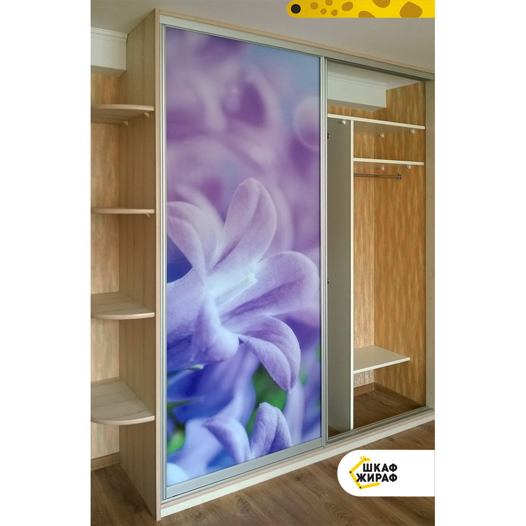 Полувстроенный шкаф-купе с яркой фотопечатью в виде нежных цветов. Снаружи шкафа — открытые радиусные полки для сувениров.