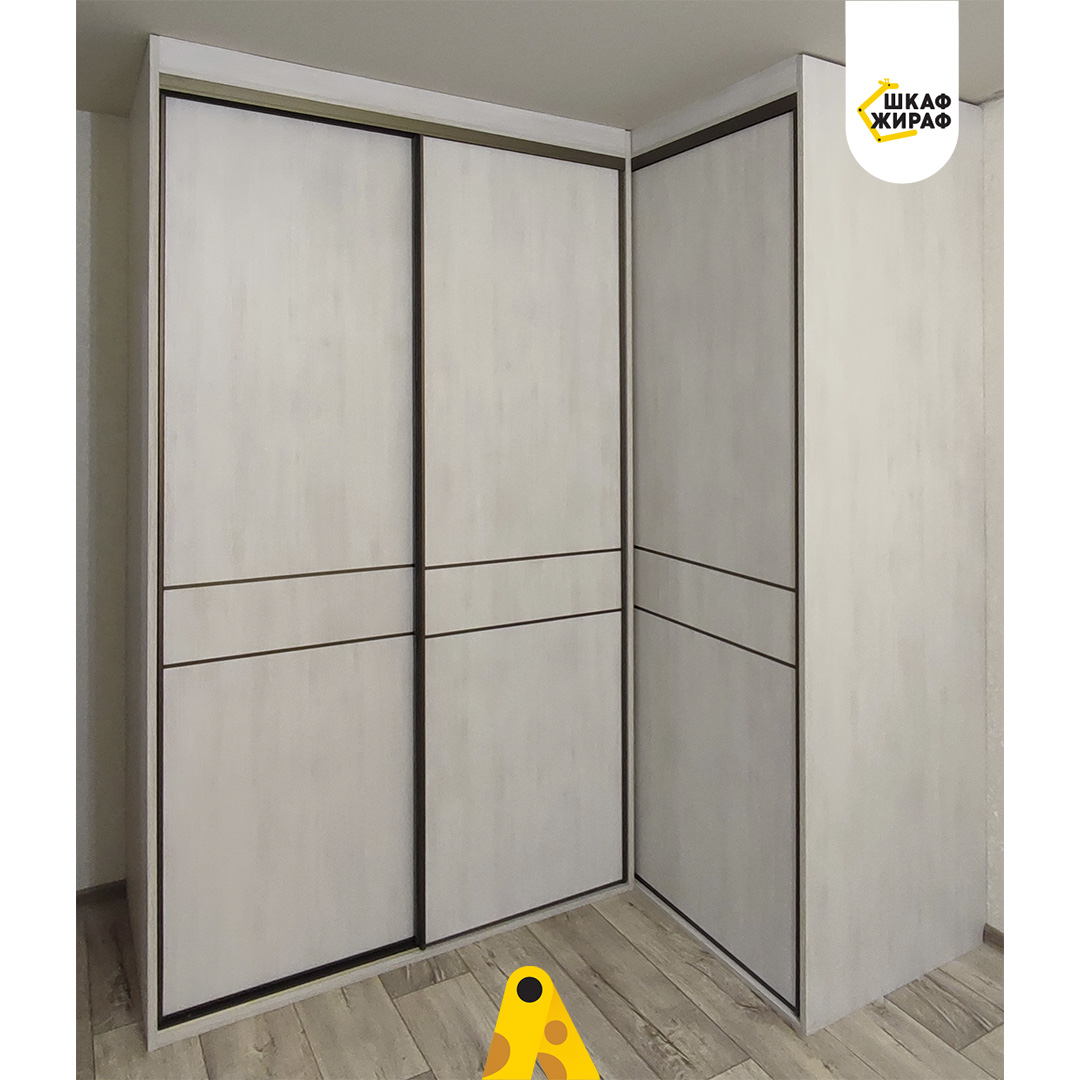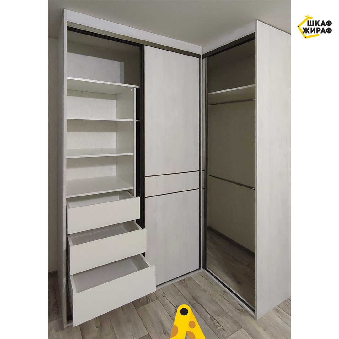 Угловой Г-образный шкаф-купе с дверьми из ДСП с разделениями в узком профиле Modus.