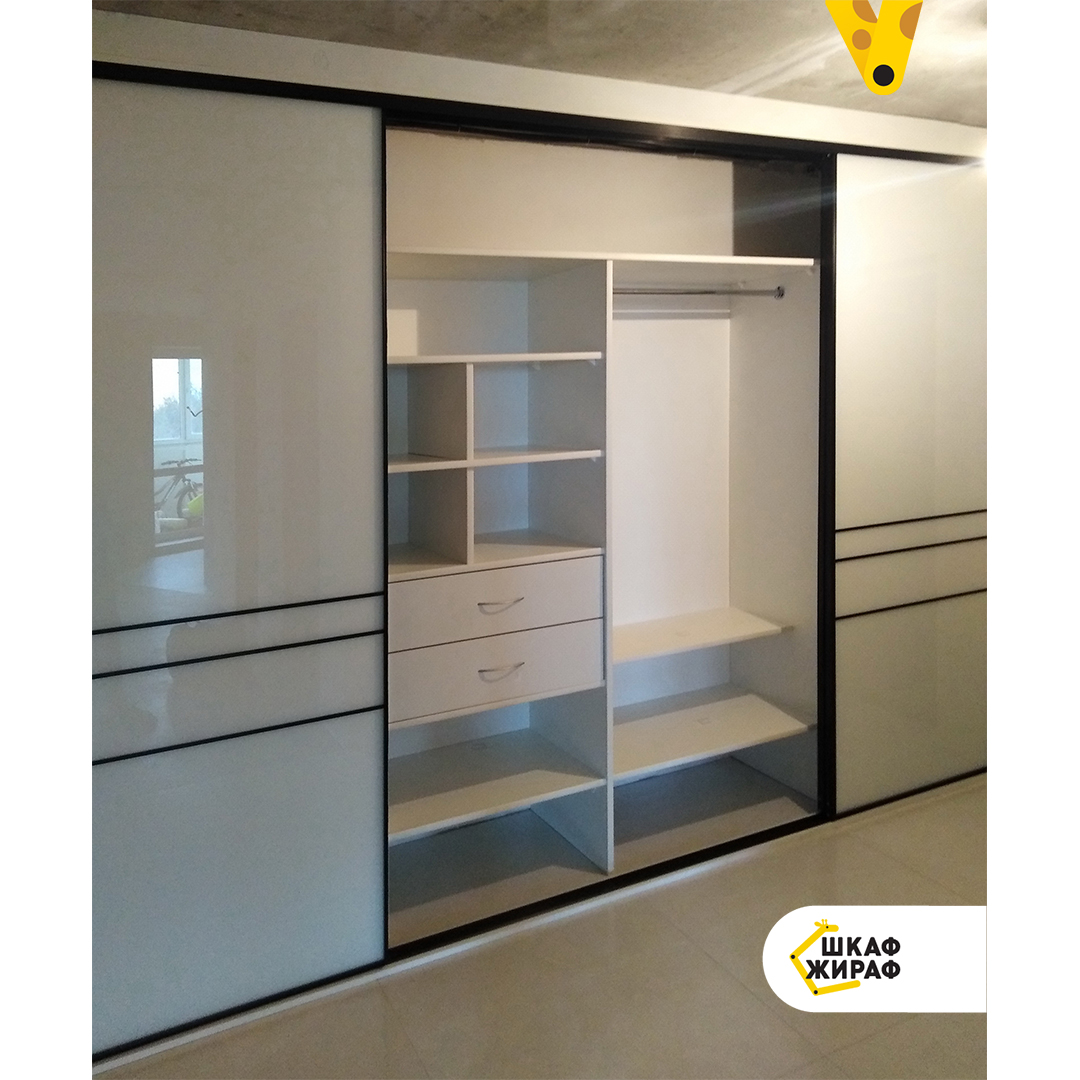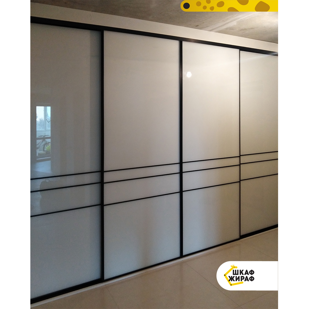 Большой белый шкаф-купе, который по оформлению темными линиями немного напоминает аккуратную нотную тетрадь. Фасады из стекла лакобель.