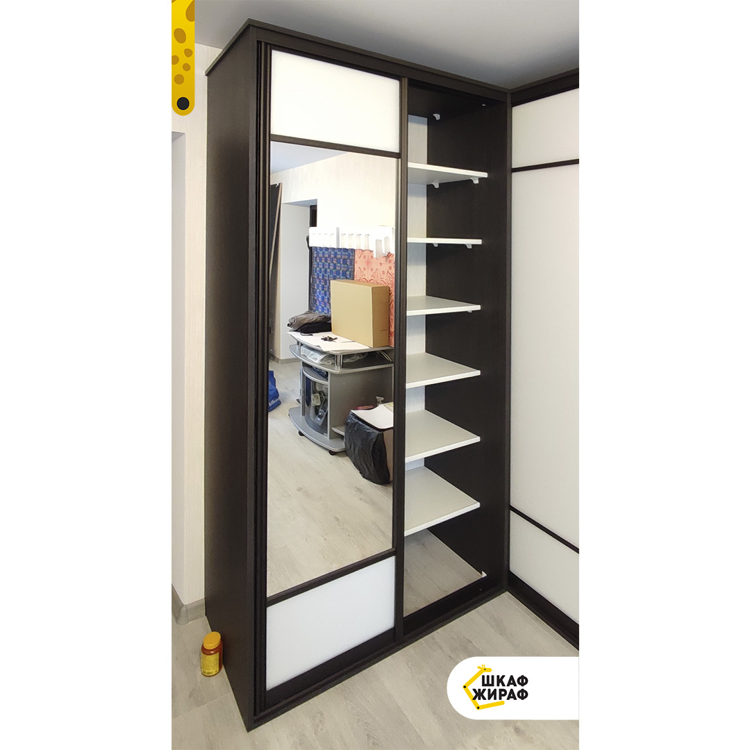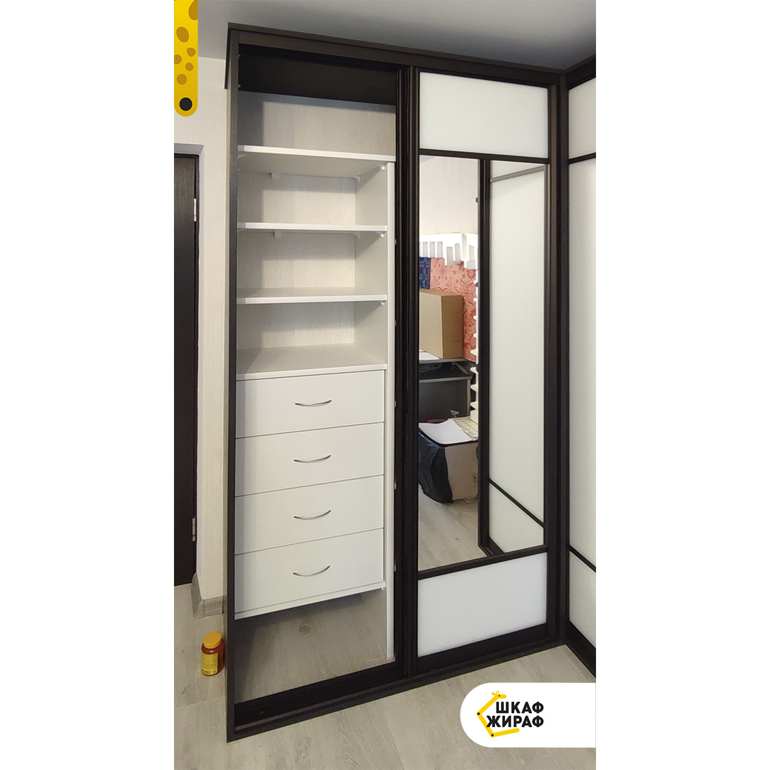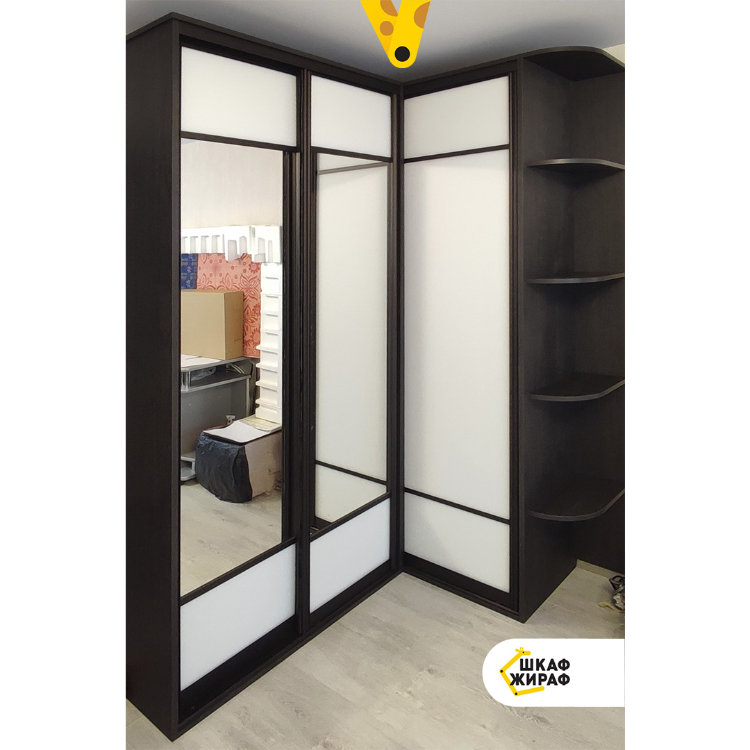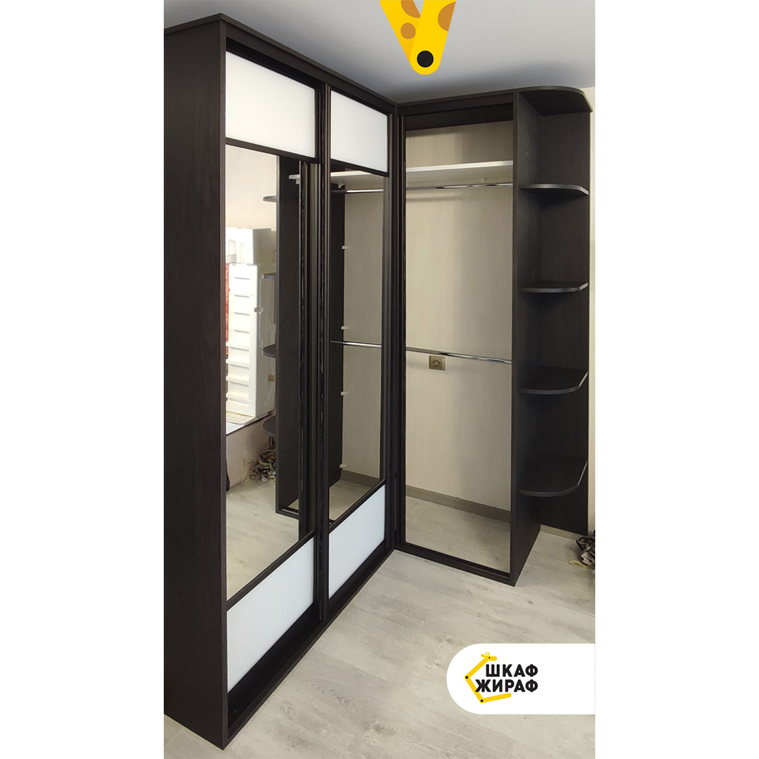 Угловой шкаф-купе. Г-образная конструкция экономит пространство и позволяет сделать вместительное наполнение. Фасад с зеркалом и ультрабелым лакобелем в закрытом профиле Modus цвета коньяк.