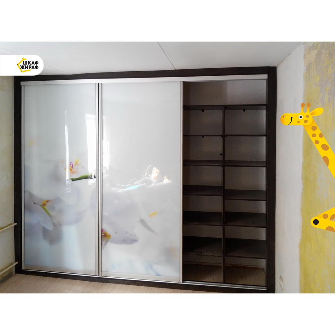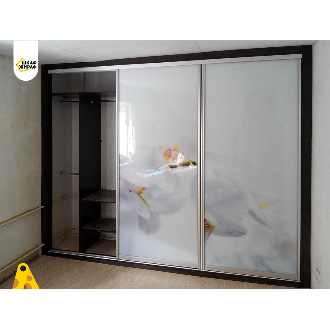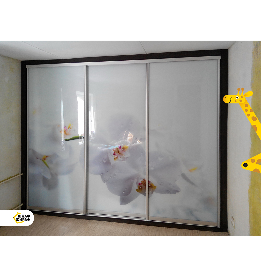 Встроенный шкаф-купе с фотопечатью в виде цветов орхидеи.