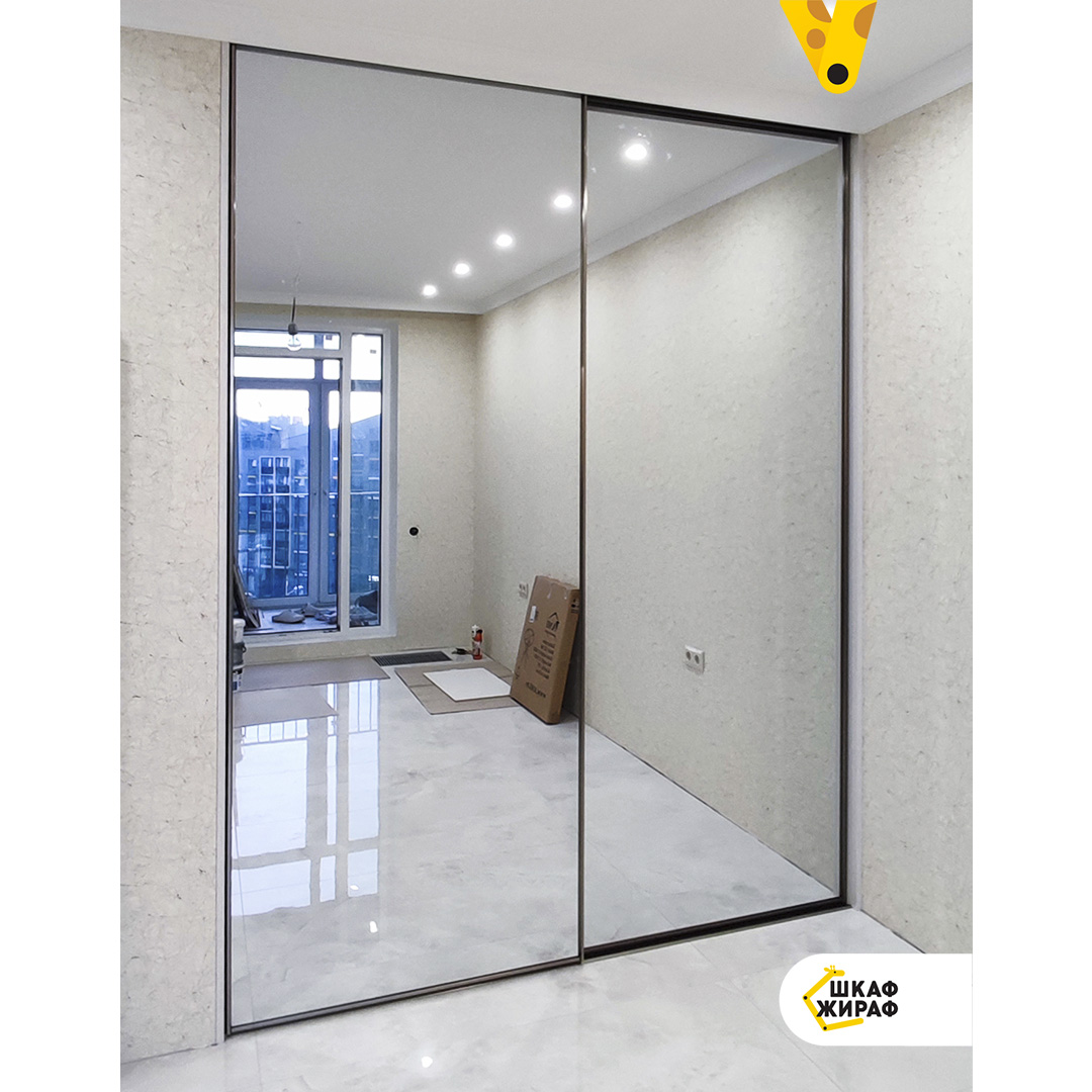 Двухдверный встроенный шкаф-купе с зеркальными дверьми в темном узком профиле Modus.