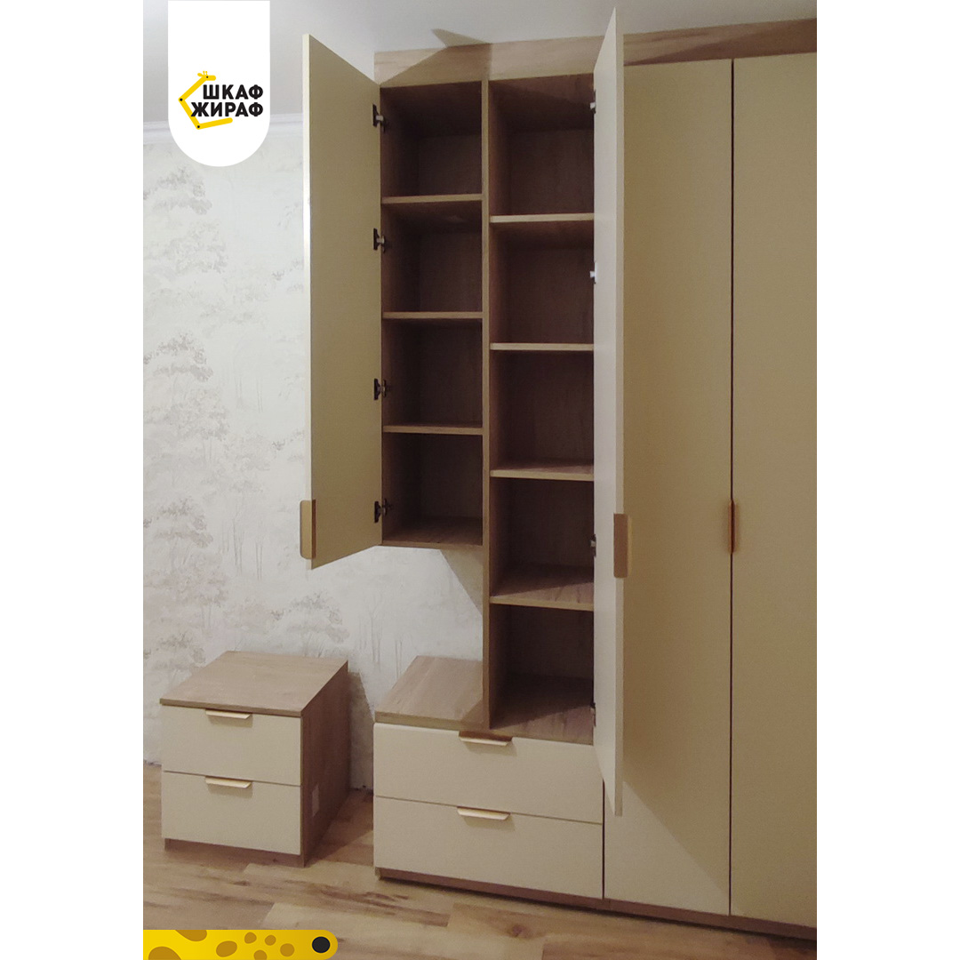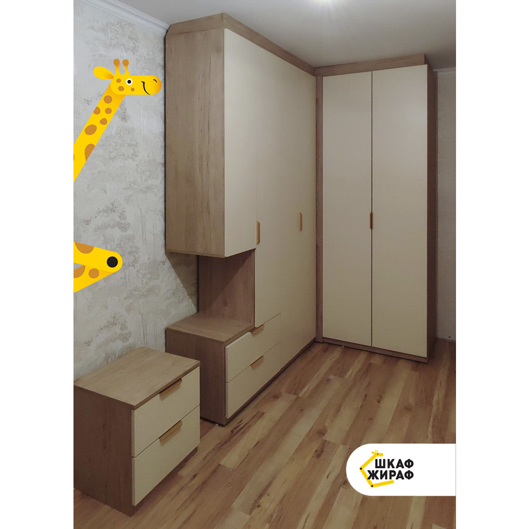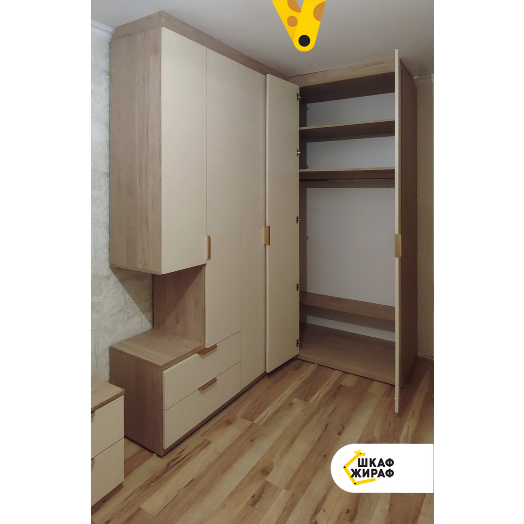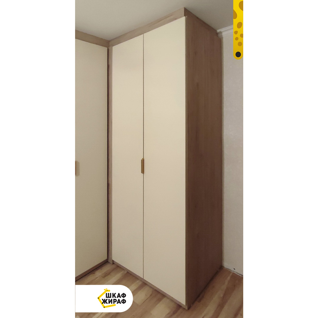 Угловой распашной шкаф и тумба. Фасады из ДСП песочного цвета с оригинальными ручками с оттенком брашированного золота.