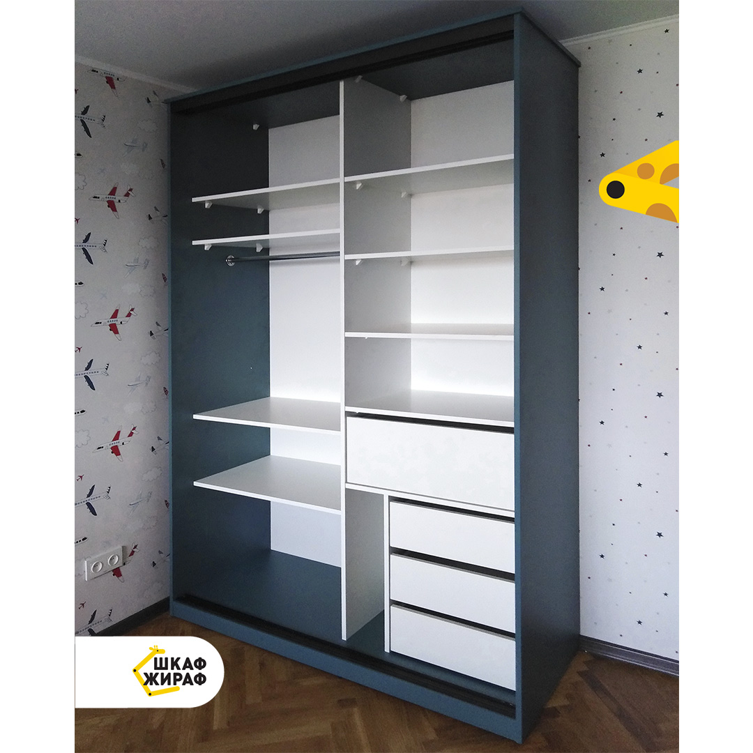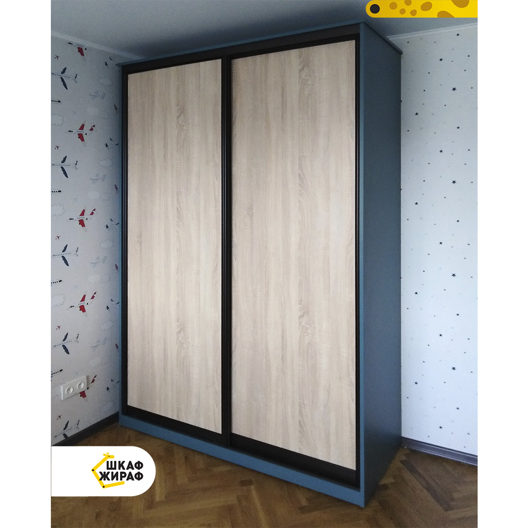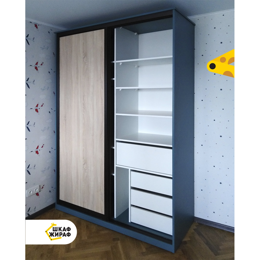 Корпусный шкаф-купе с необычным сочетанием цветов лДСП и профиля.