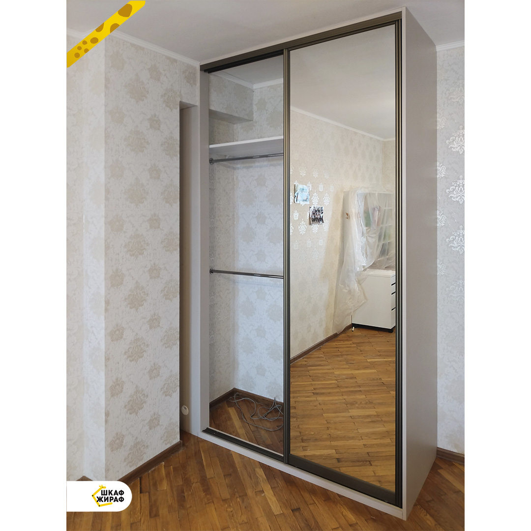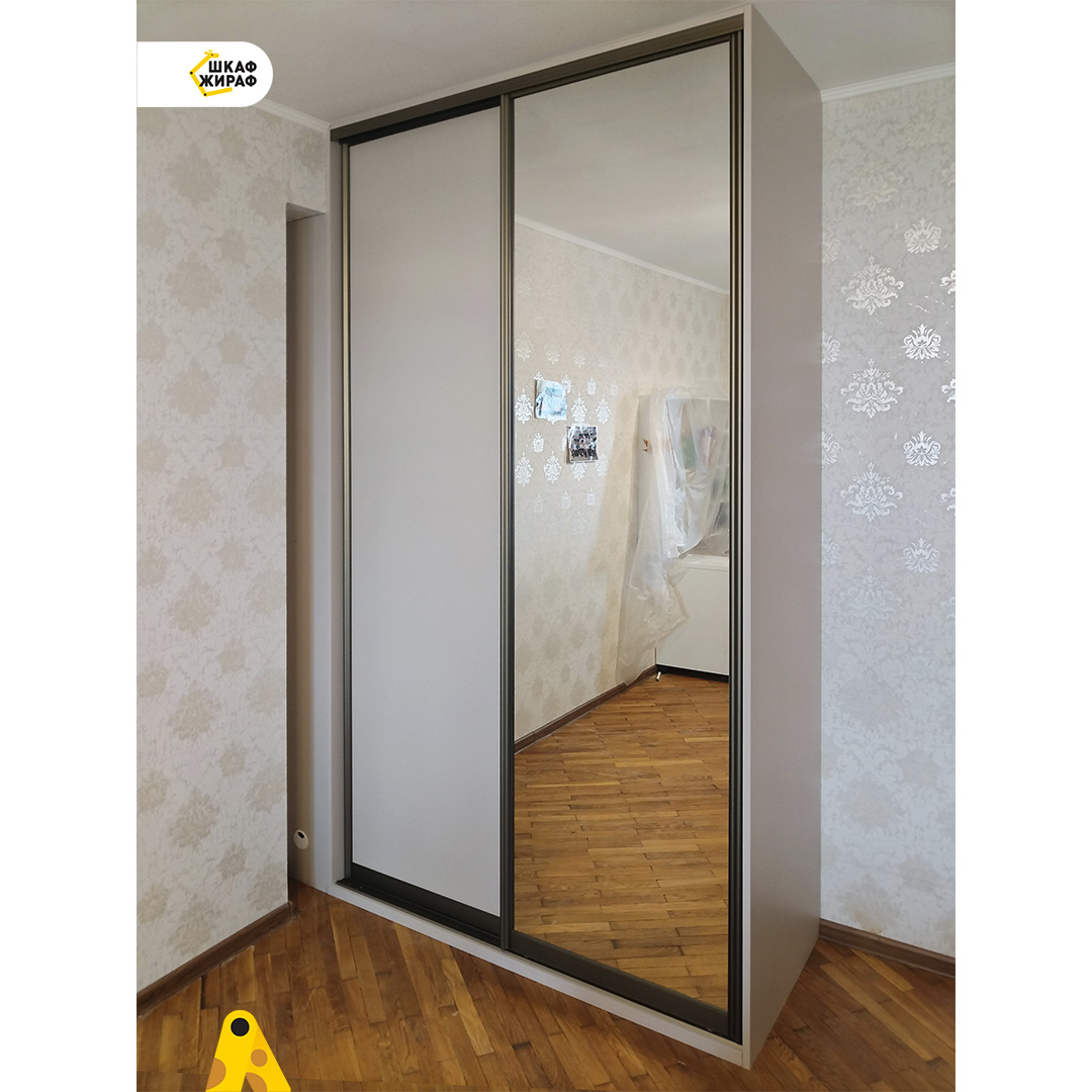 Полувстроенный двухдверный шкаф-купе с дверьми из ДСП цвета Кашемир серый и зеркала в закрытом алюминиевом профиле цвета Шампань.