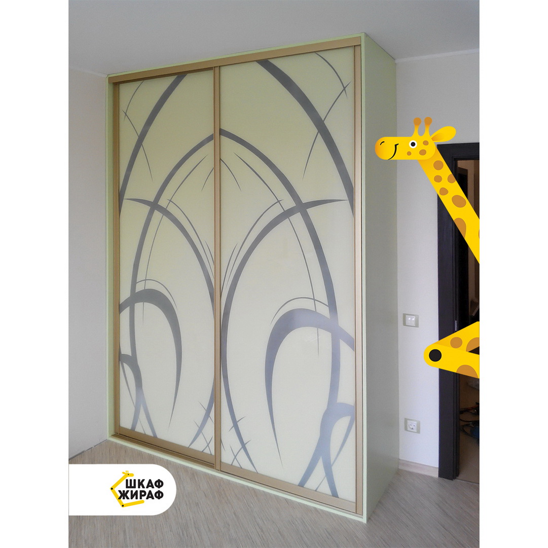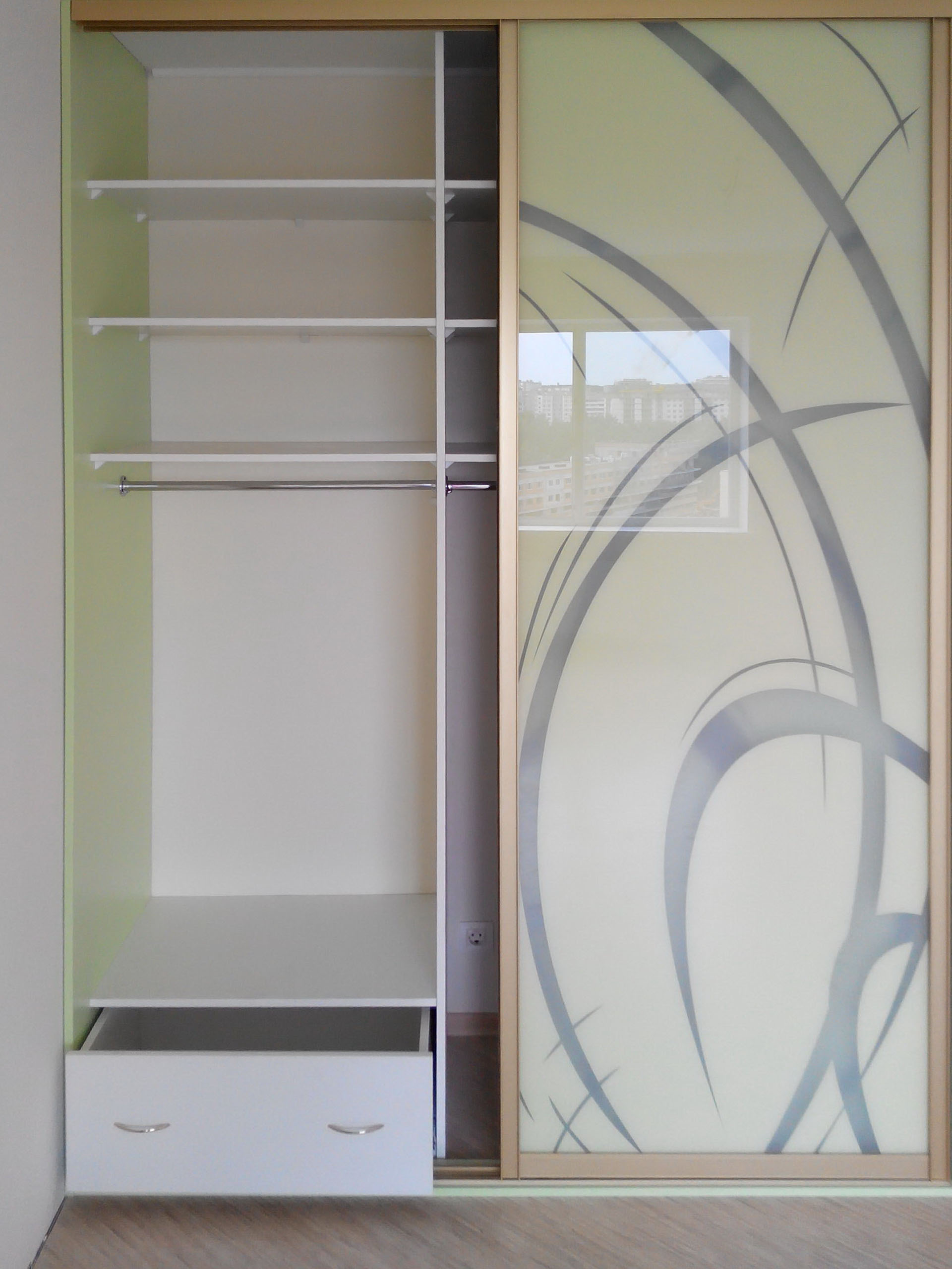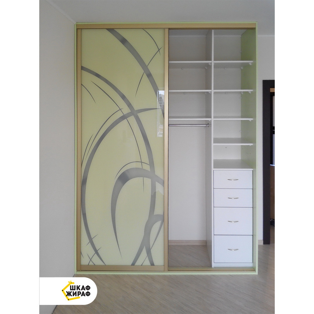 Шкаф-купе с боковой стенкой, выдвижными ящиками и дверьми из лакобеля с пескоструйным рисунком.