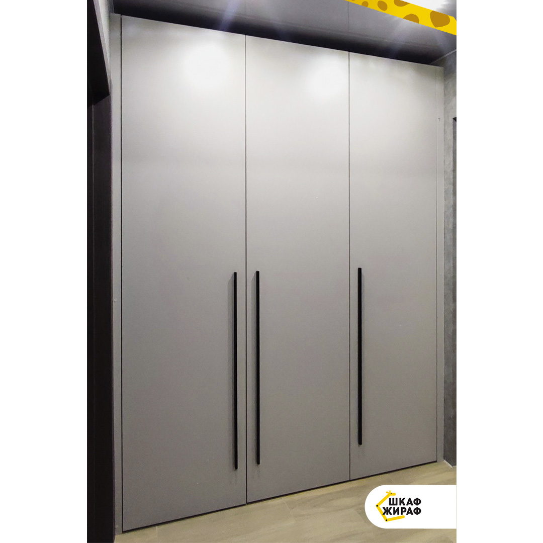 Распашной шкаф в прихожей. Двери из ДСП цвета серый кашемир с черными матовыми ручками.