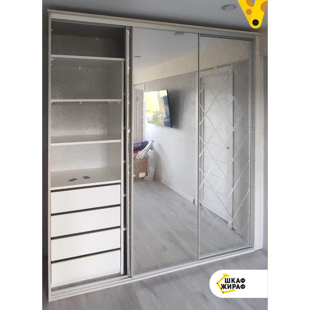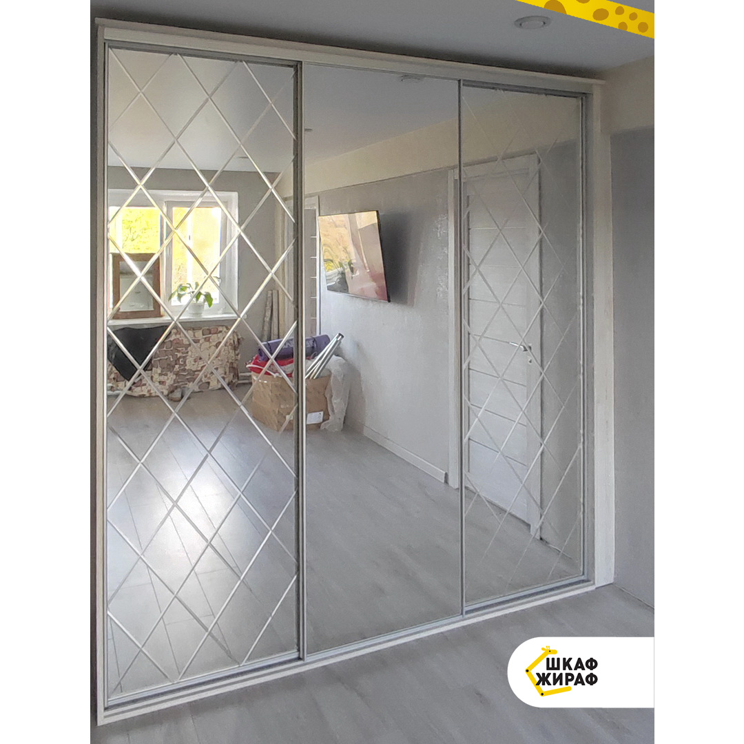 Трехдверный полувстроенный шкаф-купе с дверьми из зеркала с алмазной гравировкой в узком серебряном профиле Modus.
