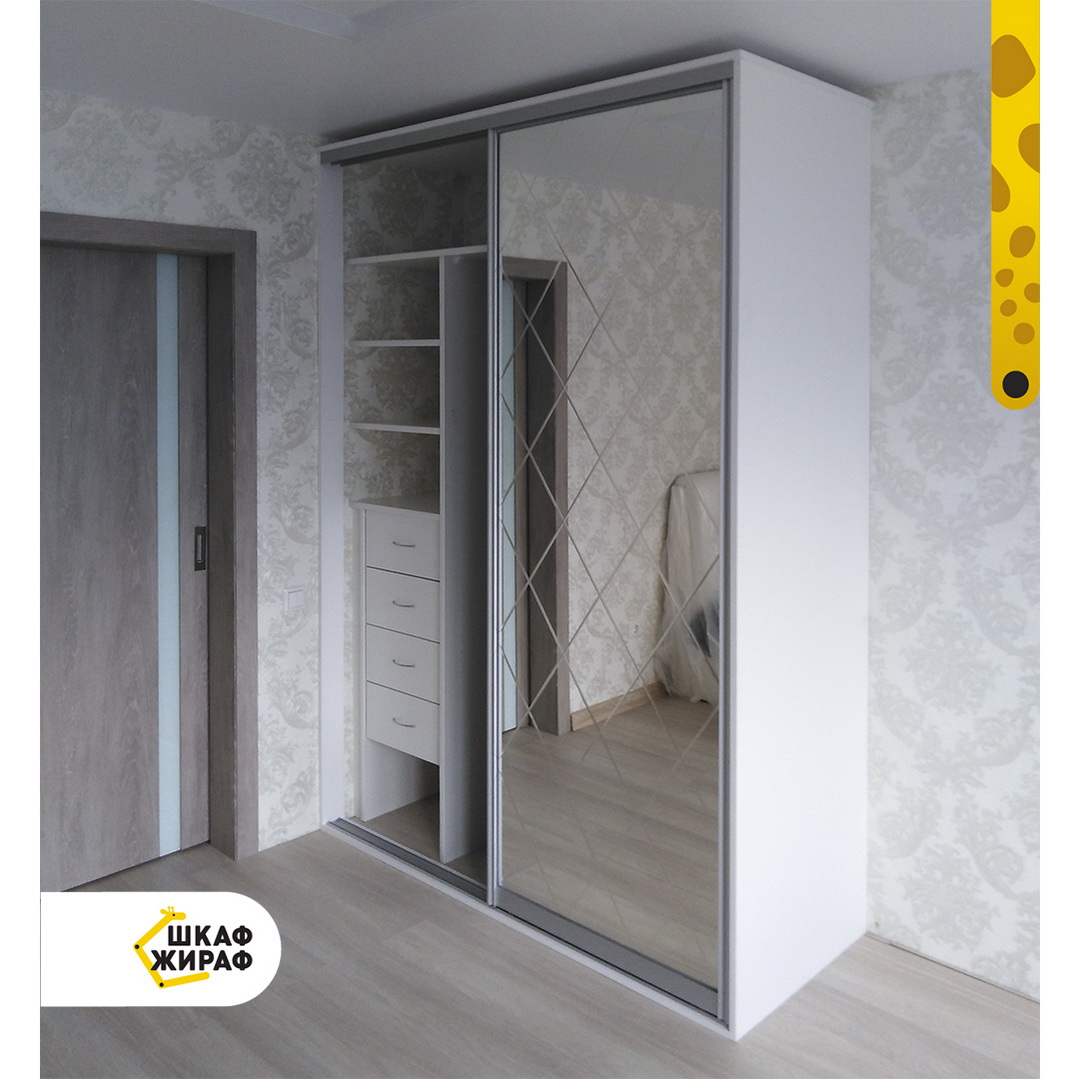 Белый полувстроенный шкаф купе с боковой стенкой, крышей и с алмазной гравировкой в виде ромбов на зеркальных дверях.