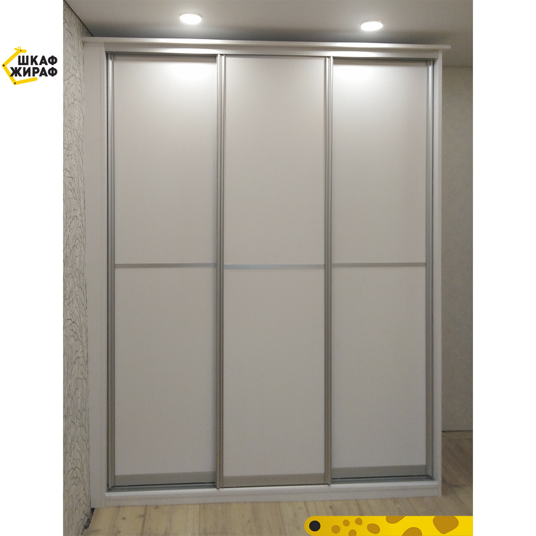Полувстроенный трехдверный шкафс крышей и боковой стенкой, фасадом из ДСП с разделениями в серебряном профиле Modus.