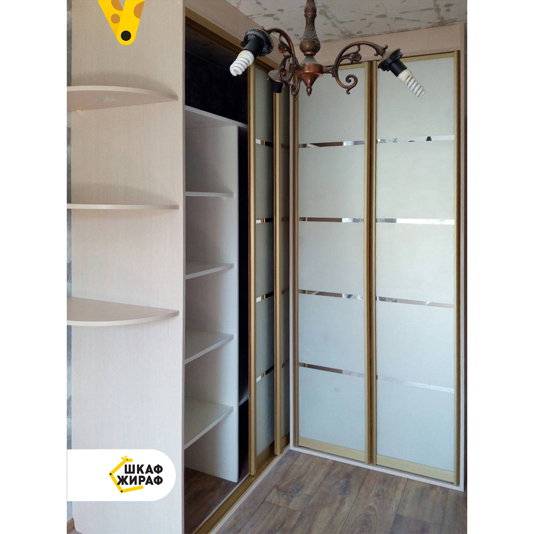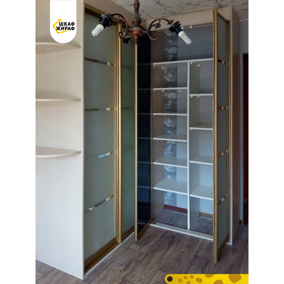 Угловой Г-образный шкаф, состоящий из двух совмещенных шкафов, у одного из которых раздвижные двери с пескоструем в профиле Modus, у второго — распашные.