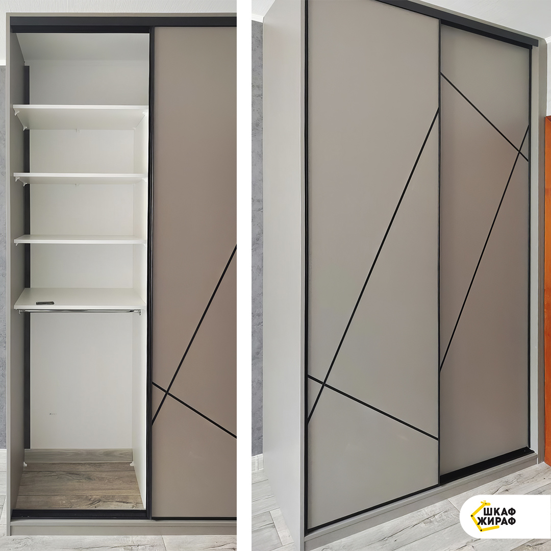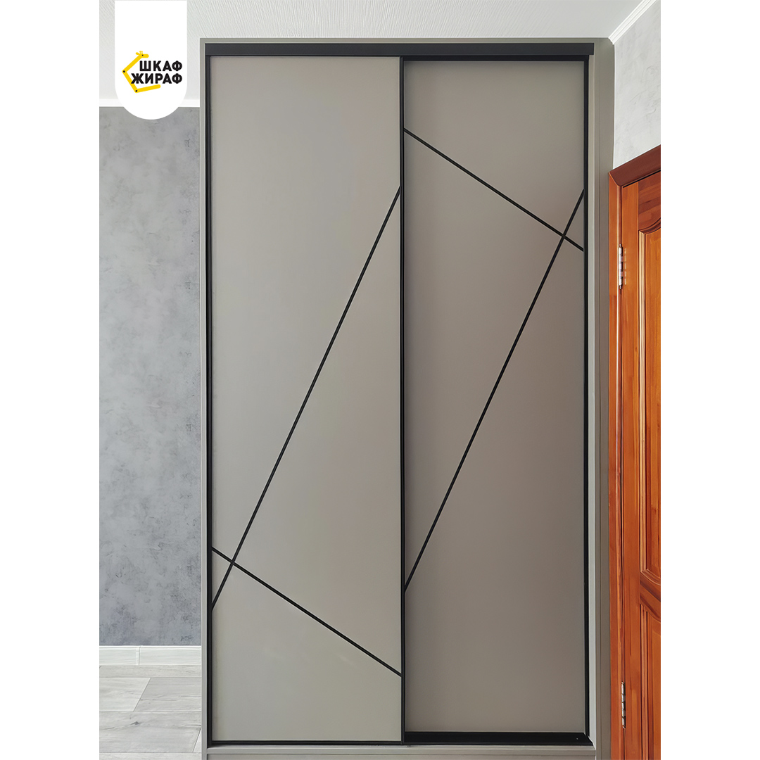 Двухдверный шкаф-купе с фасадом из ДСП с диагональными разделениями в узком черном профиле Modus.