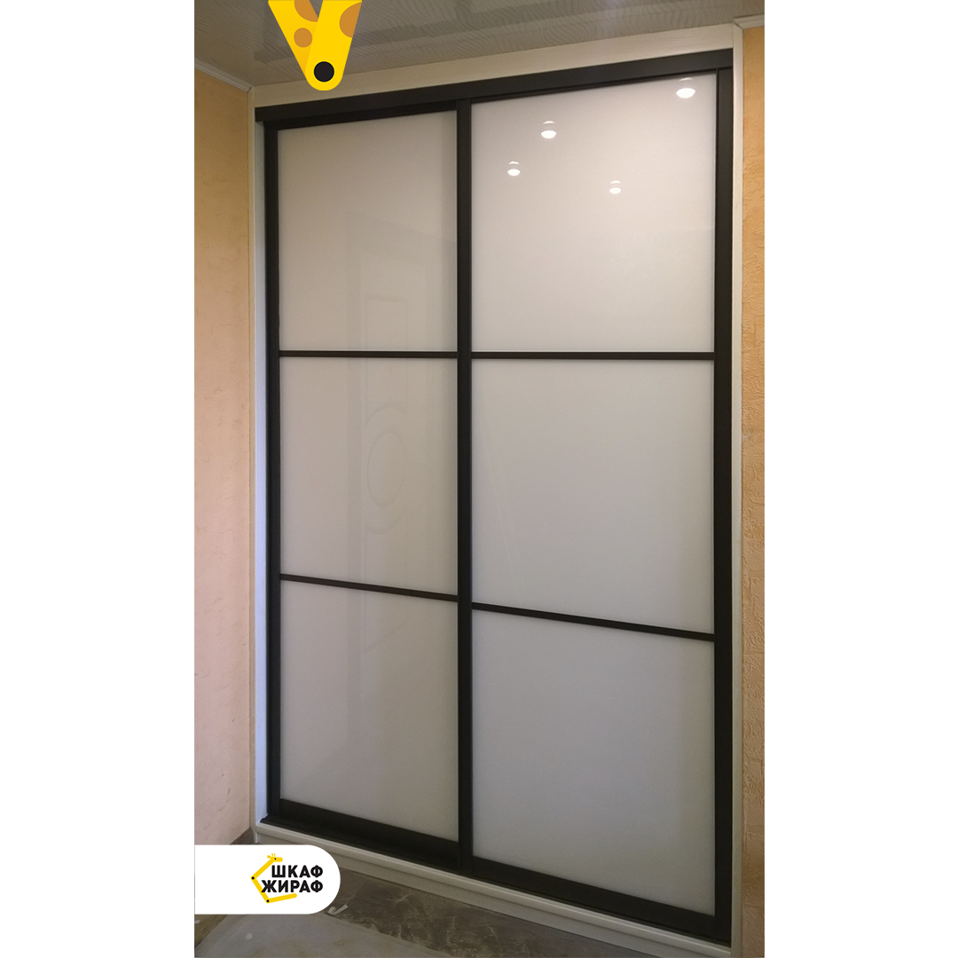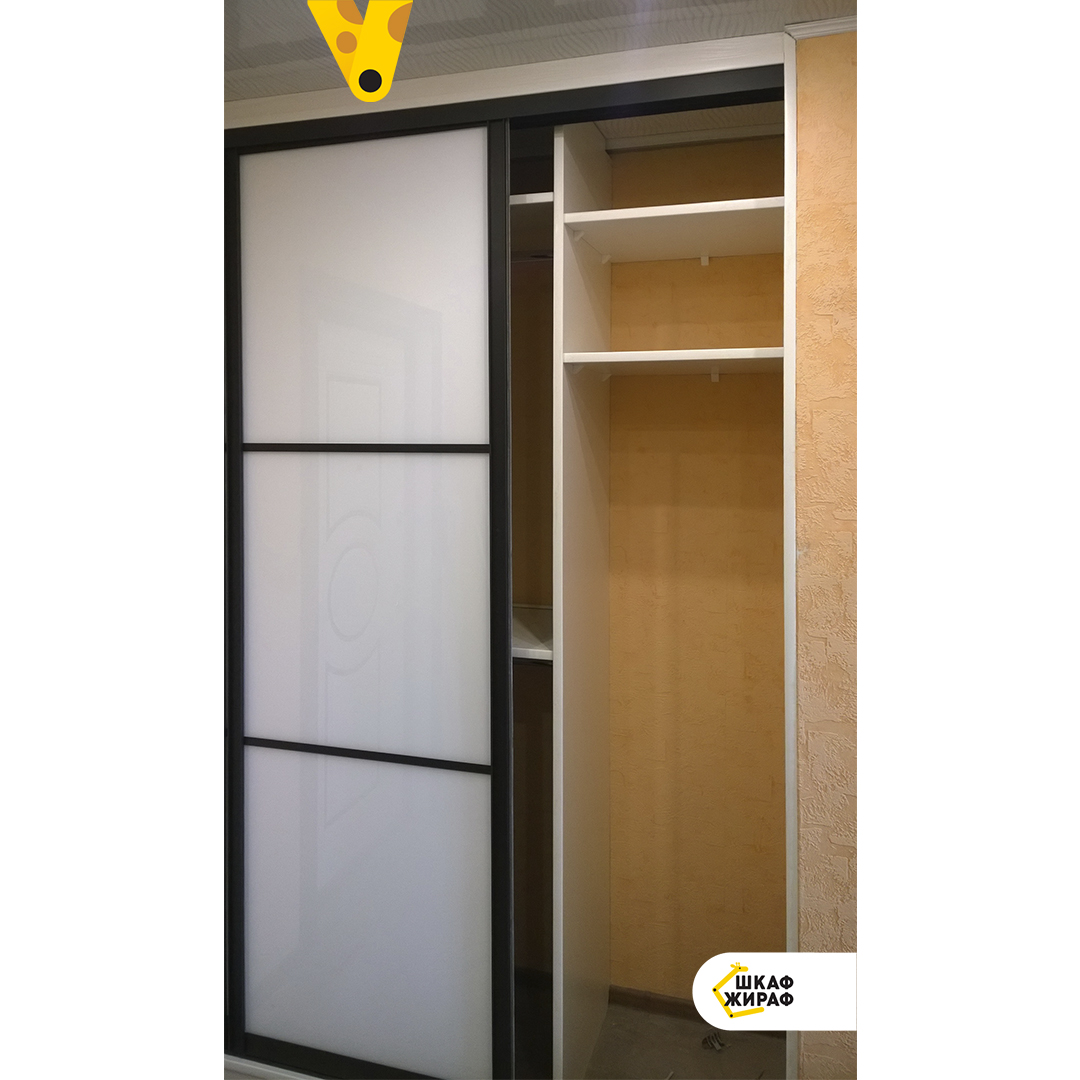 Встроенный в нишу шкаф-купе с раздвижными дверьми из белого лакобеля в широком темном профиле.
