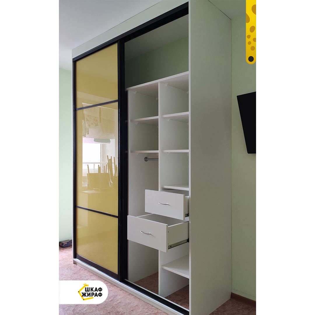 Яркий шкаф-купе с дверьми из желтого и малинового лакобеля в черном профиле Modus.