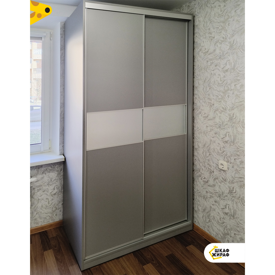Корпусный шкаф-купе с дверьми из ДСП Egger цвета Арктика серый со вставками из зеркала Серебро травленое в профиле Modus цвета серебро