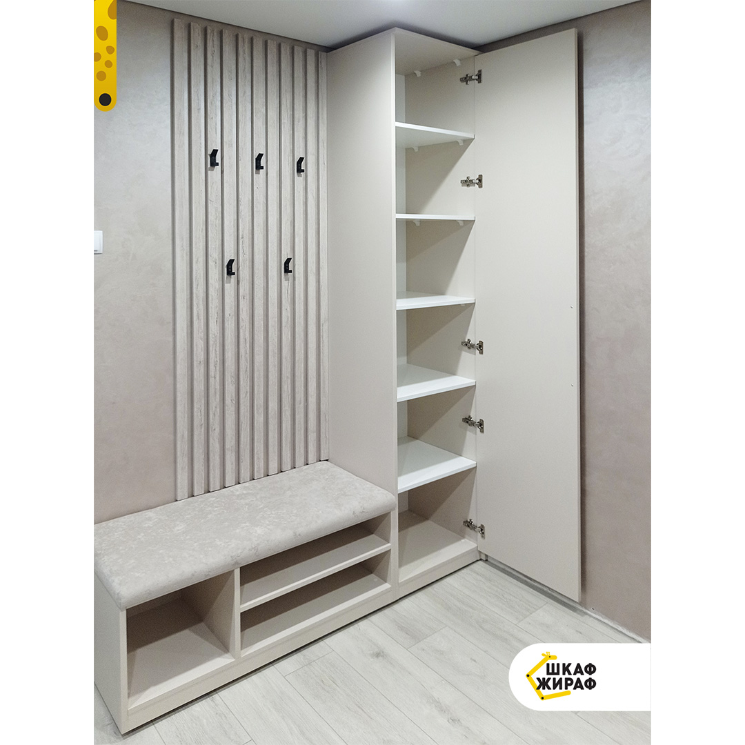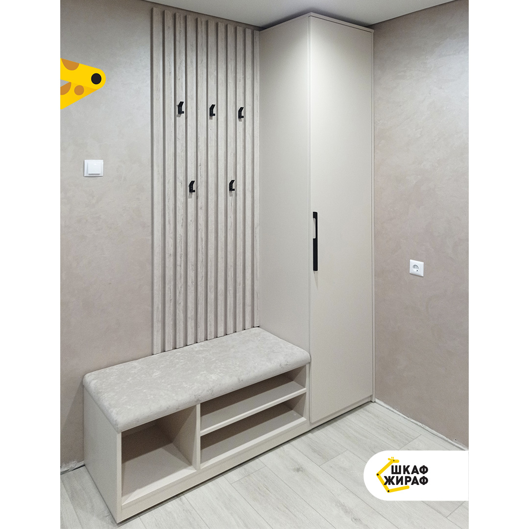Прихожая с распашным шкафом, мягкой тумбой для обуви и планками с крючками для верхней одежды.