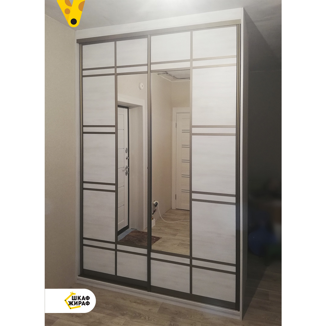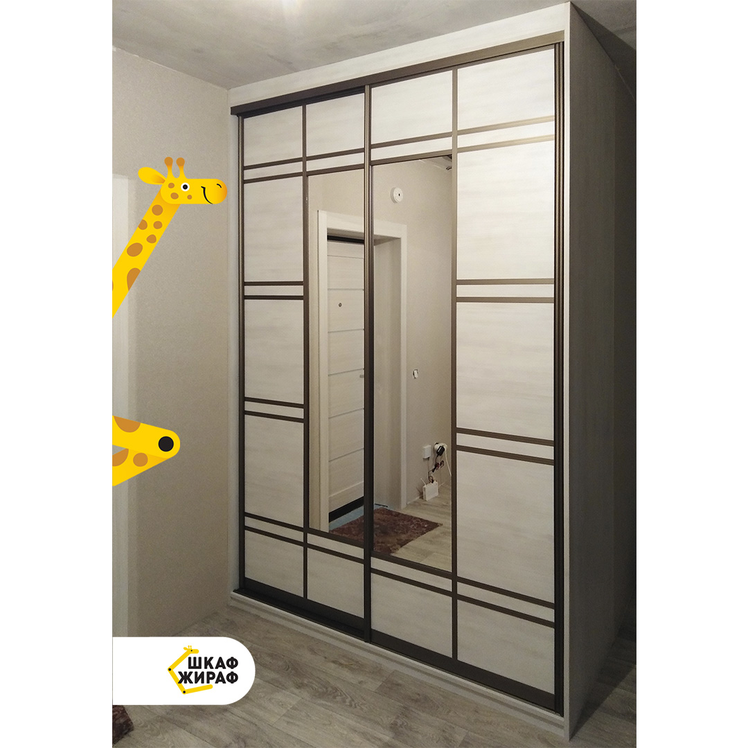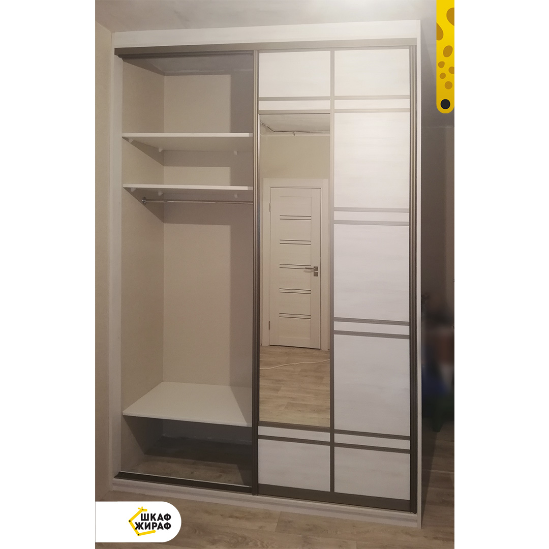 1,5-метровый шкаф-купе в прихожую. Фасад из ДСП и зеркала с вертикальными и горизонтальными разделениями в профиле цвета шампань.
