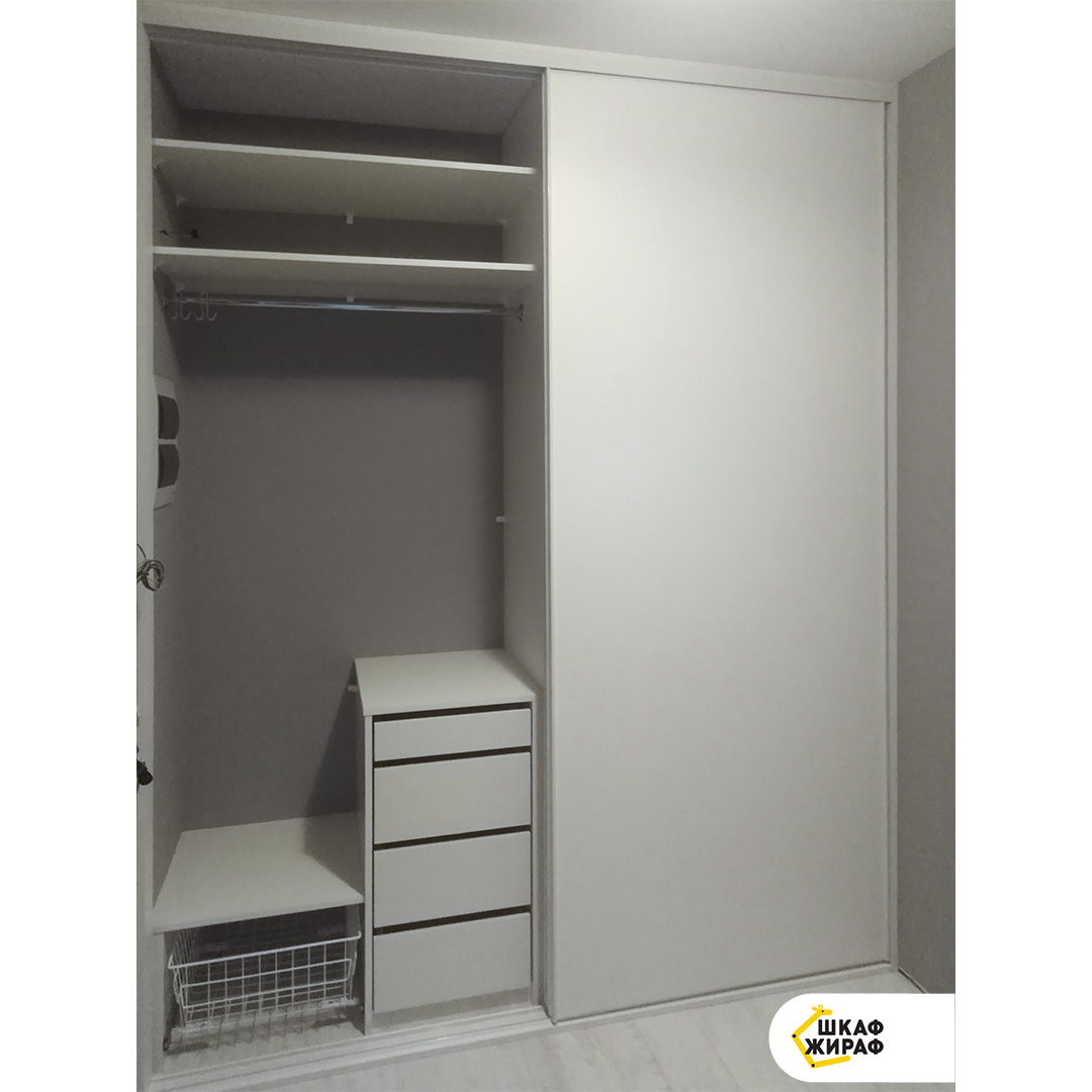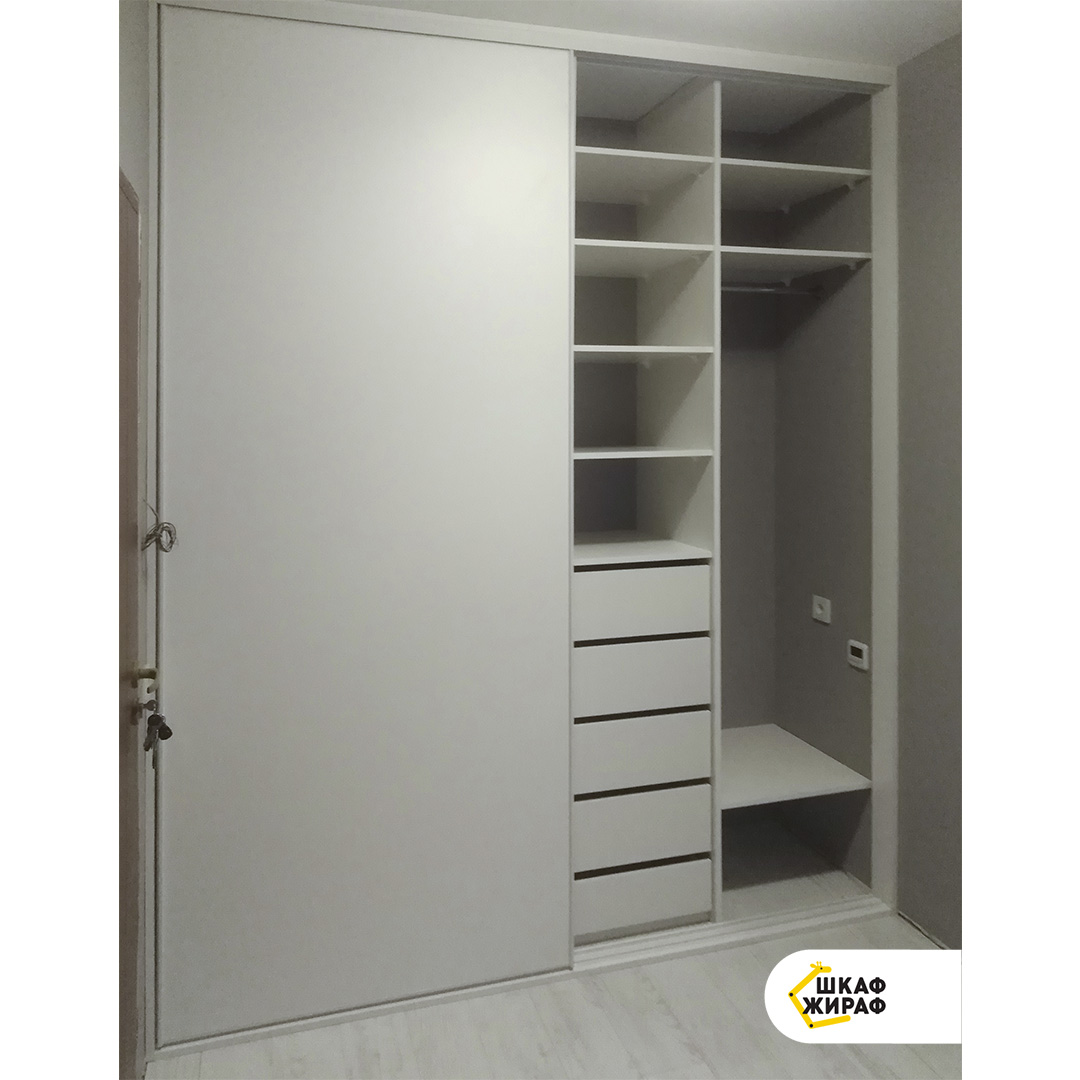 Однотонная ДСП и узкий профиль — основа минималистского неброского дизайна, когда шкаф не оттягивает на себя внимание, но в то же время функционален внутри.