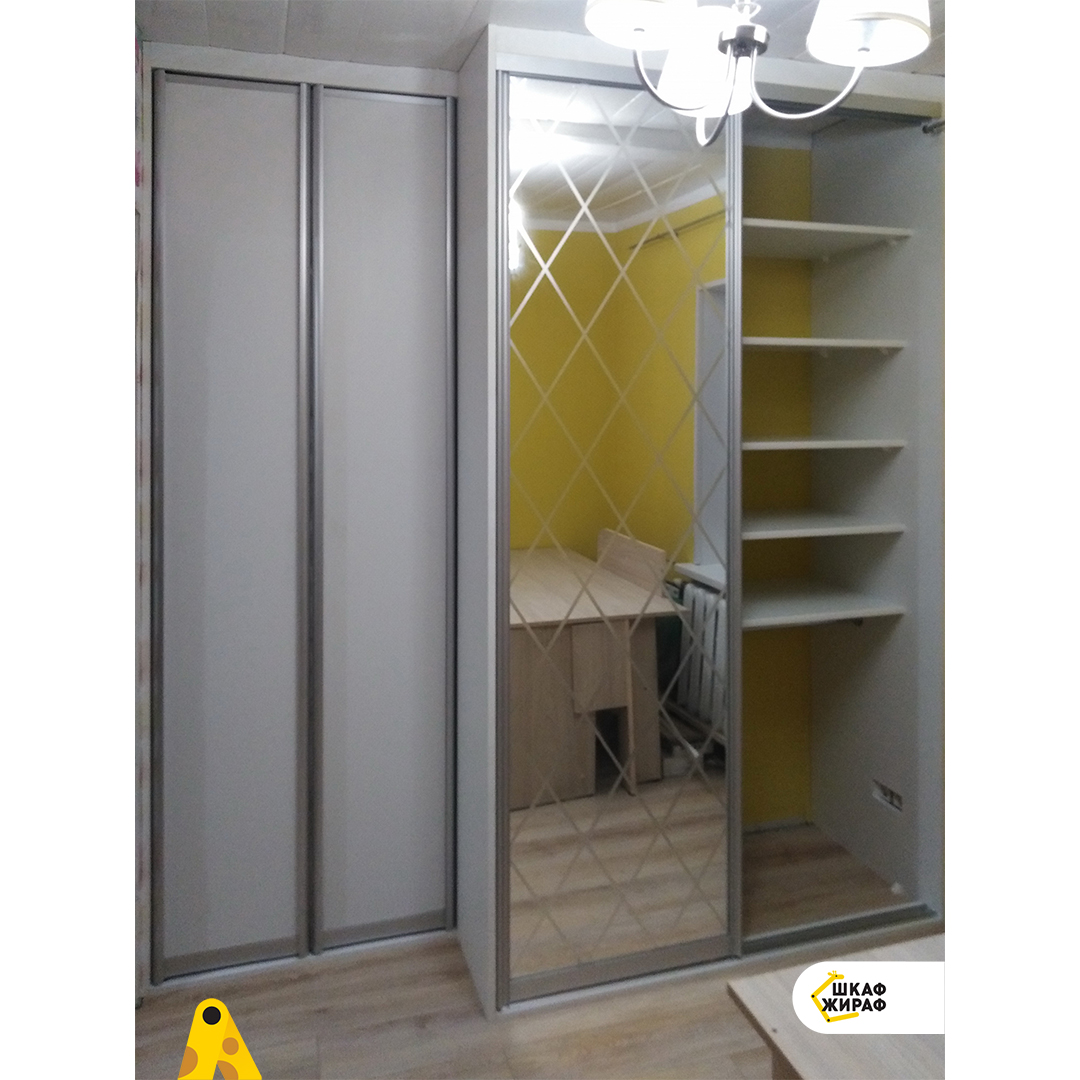 Комплекс в детскую комнату: шкаф с распашными дверьми в открытом профиле Modus и раздвижной зеркальный шкаф с пескоструйным рисунком в виде ромбов в закрытом профиле Modus.