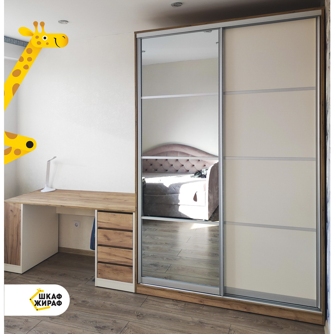 Двери шкафа из ДСП кремового цвета и зеркала с разделениями в серебряном профиле Modus.