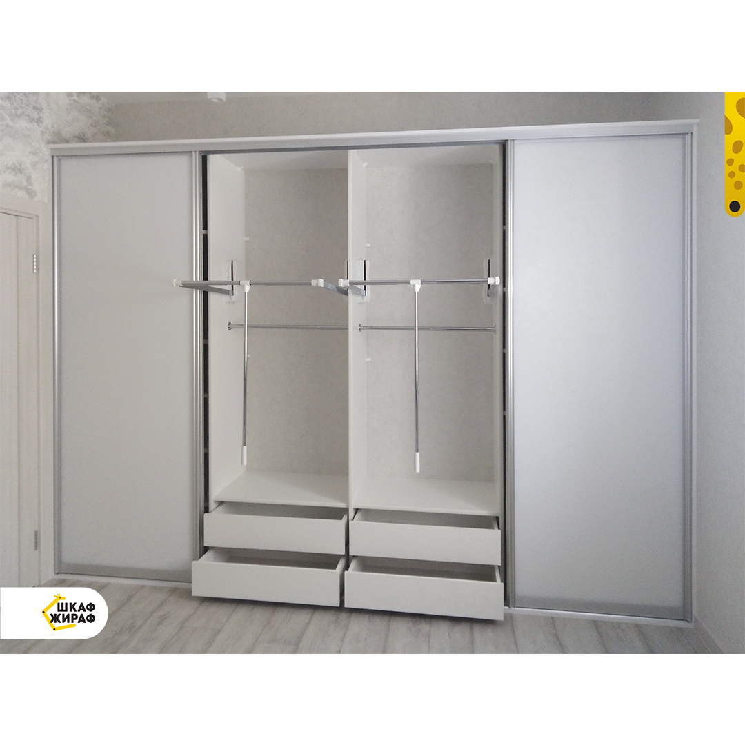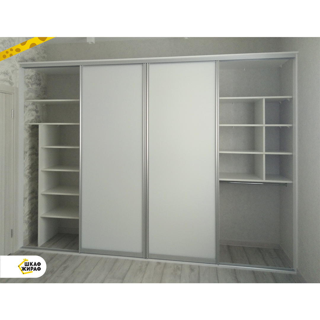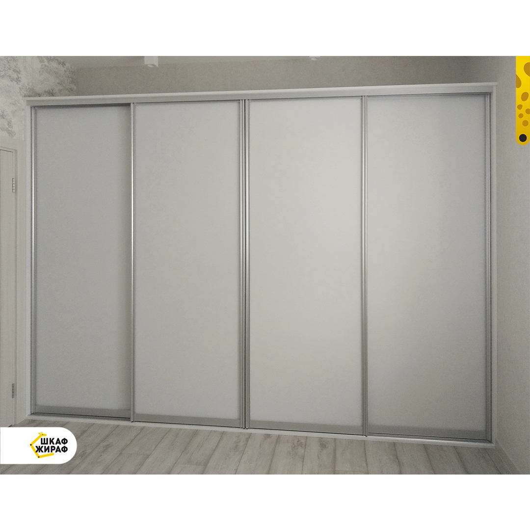Встроенный четырехдверный  шкаф-купе с дверьми из ультрабелого мателака в закрытом профиле Modus серебряного цвета.
