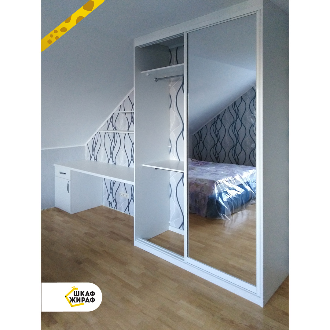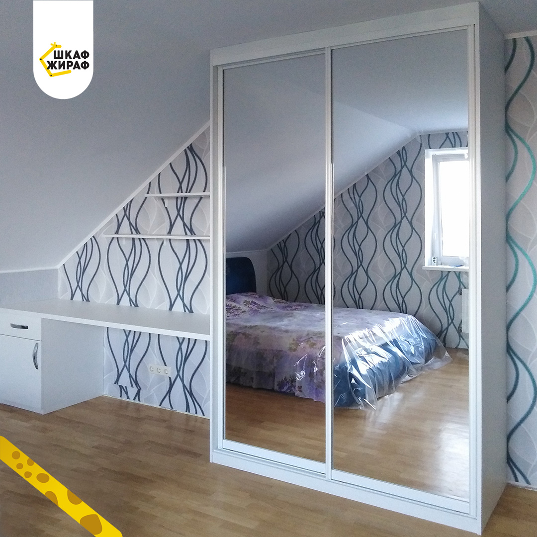 Вместительный зеркальный шкаф-купе и широкий стол для творчества наполнили спальню в мансардной комнате всем необходимым для удобного хранения вещей и креативного времяпровождения.