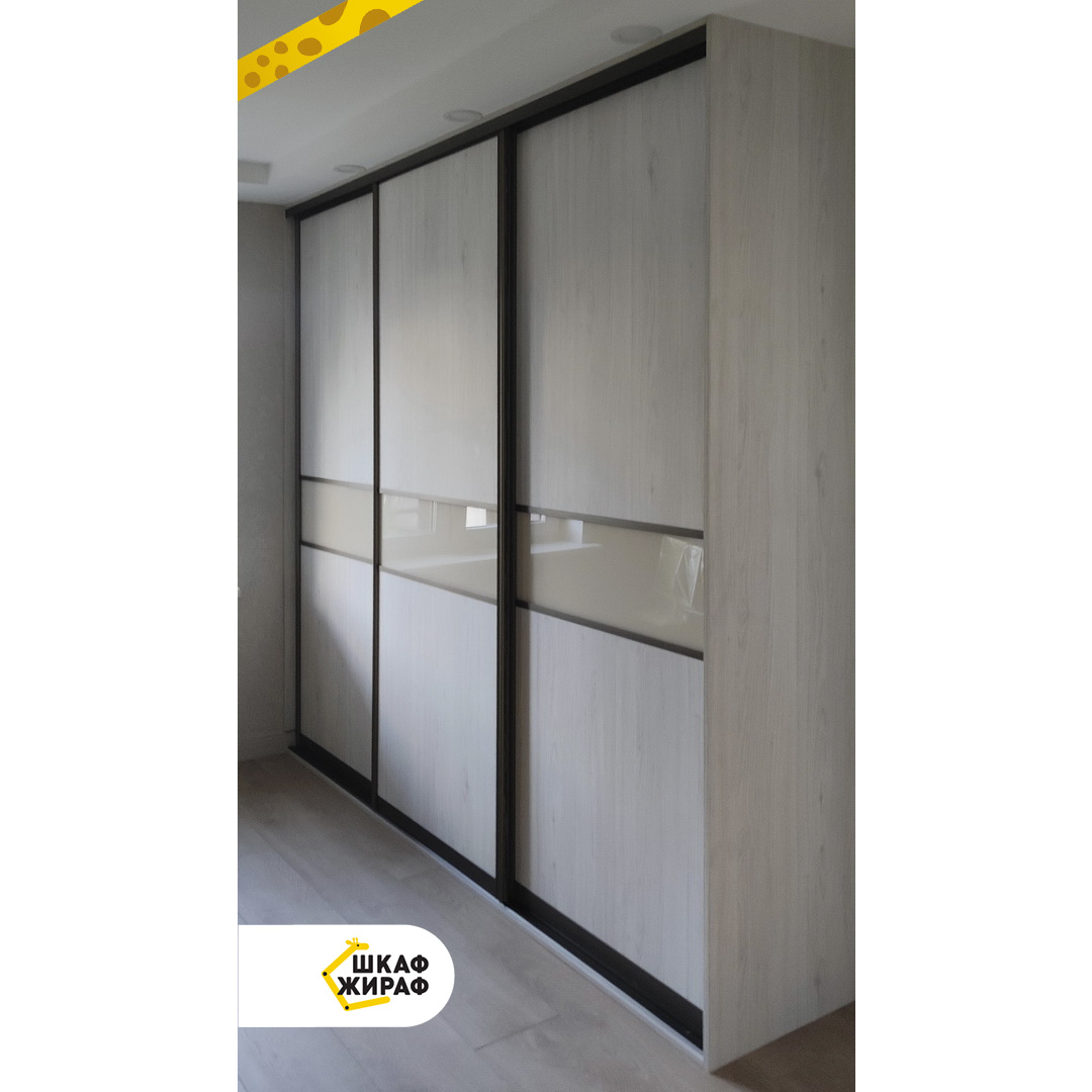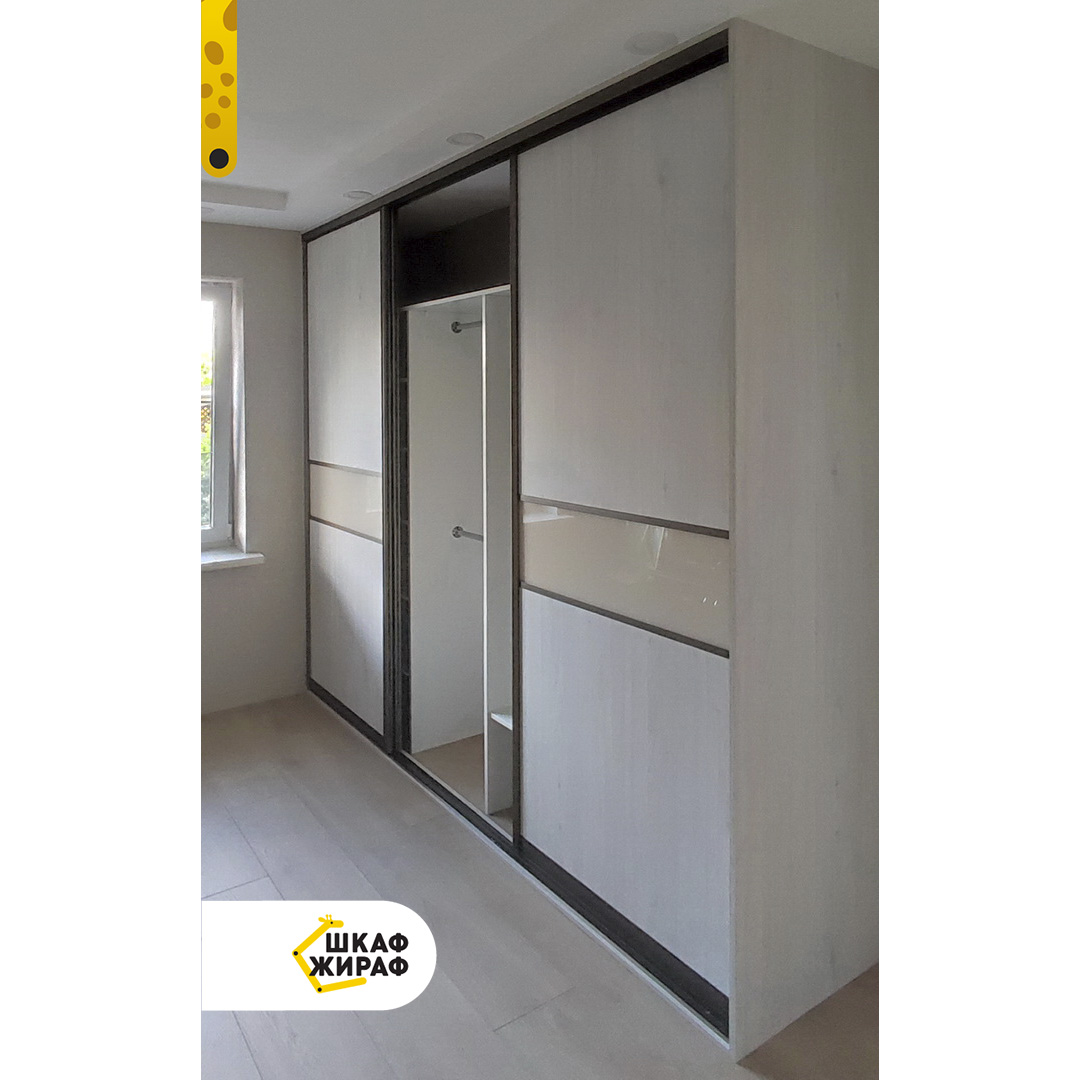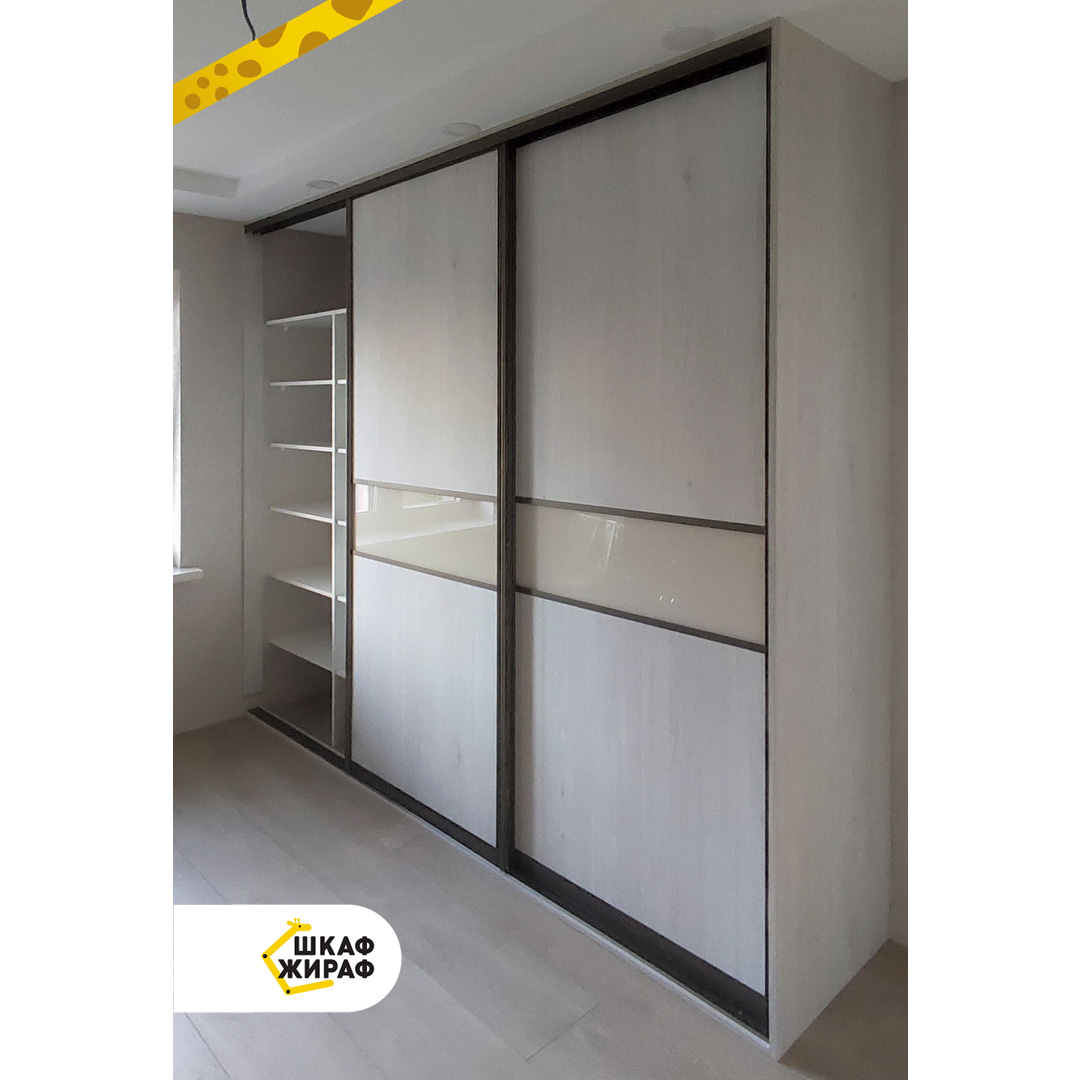 Вместительный трехдверный шкаф-купе с дверьми из светлой ДСП со вставками жемчужного лакобеля.