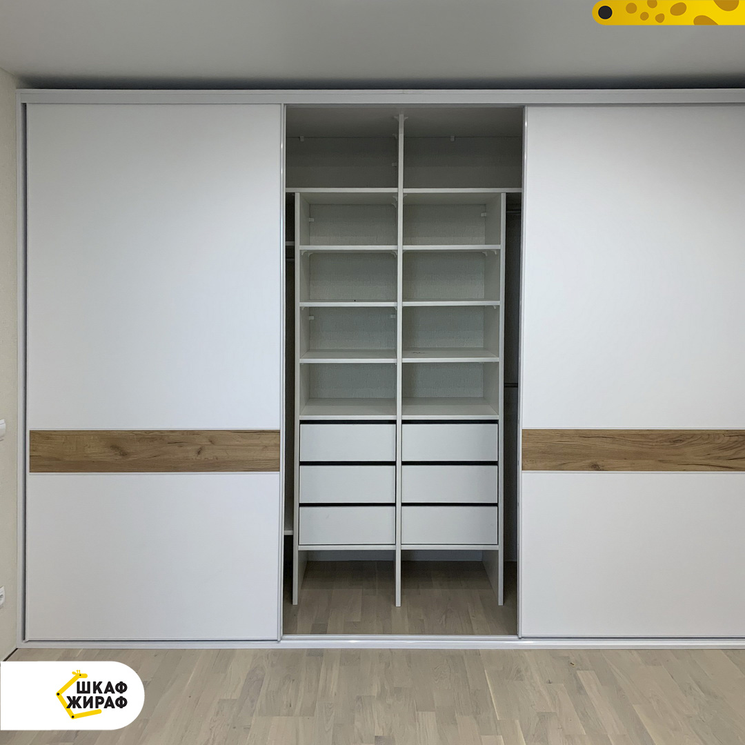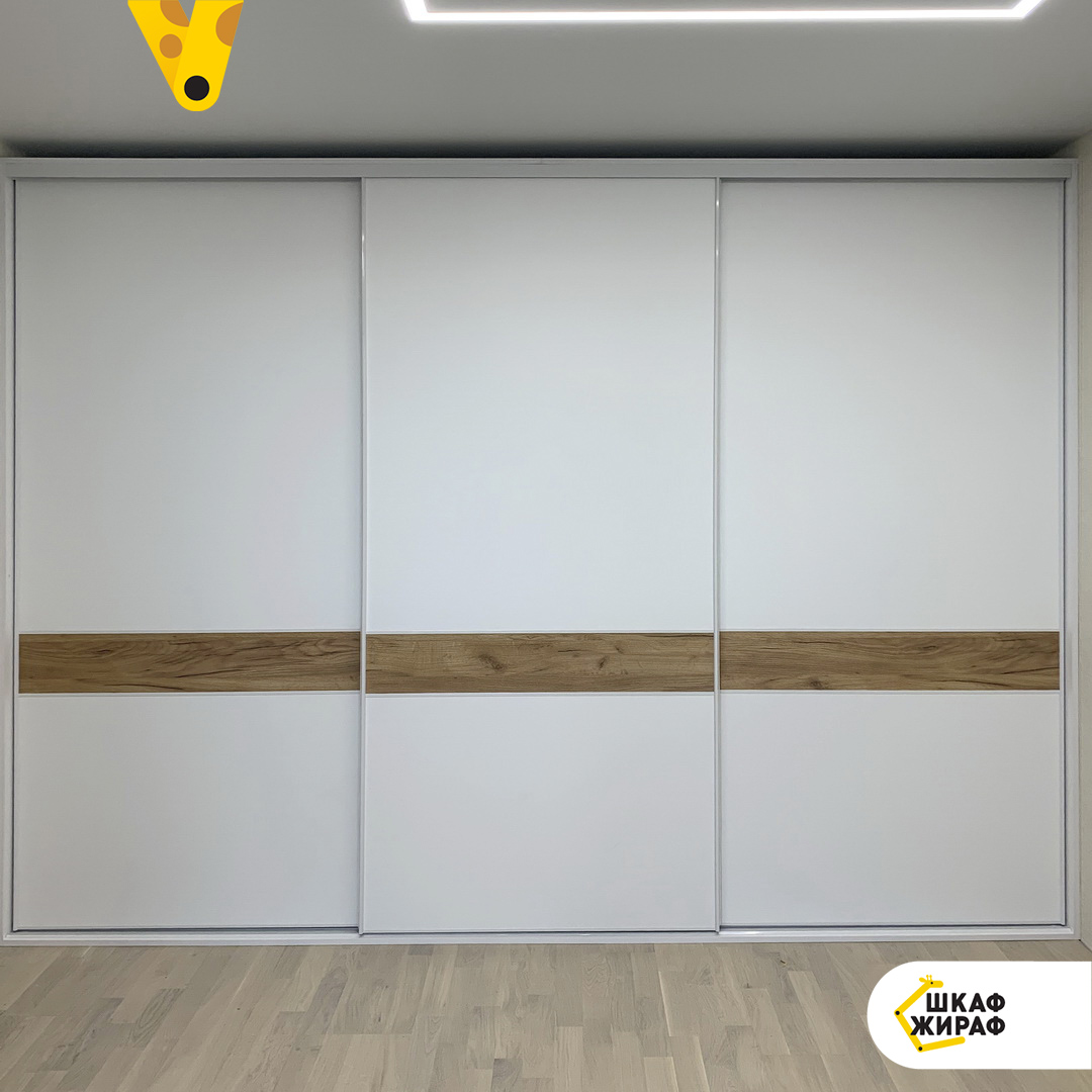 Одна простая деталь, — полоска ДСП древесной структуры на белом фасаде, делает шкаф-купе стильным и современным.