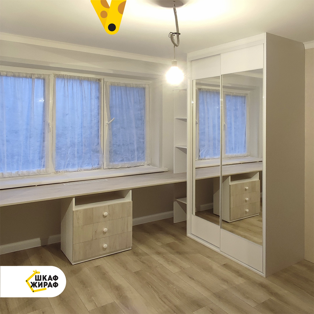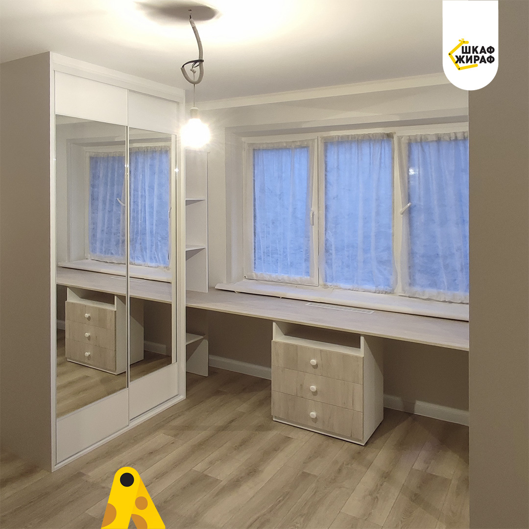 Комплекс из двух шкафов-купе и широкого стола в детской комнате для комфортной учебы и удобного хранения вещей.
