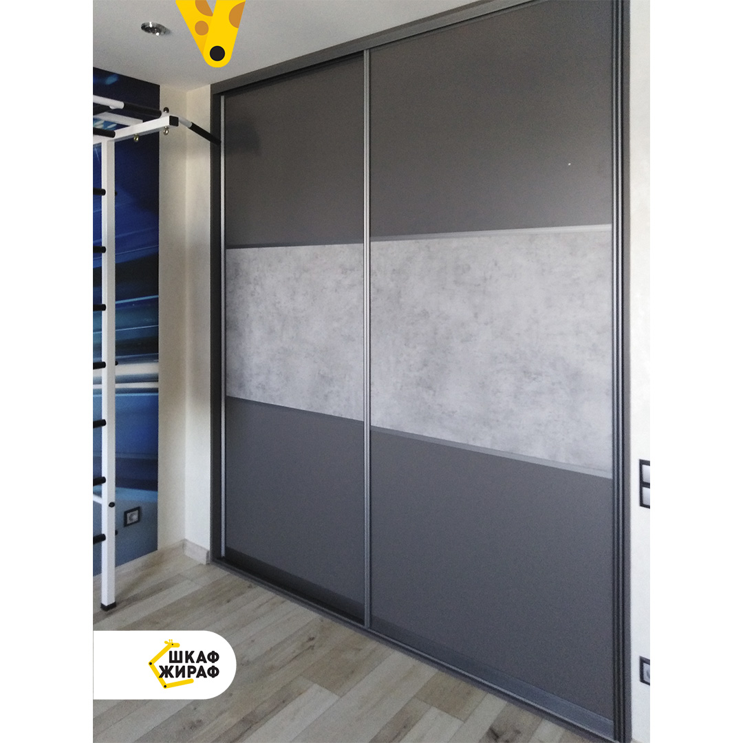 Встроенный двухдверный шкаф-купе в урбанистическом стиле с фасадом из лДСП, покрытие которой имитирует камень и бетон.
