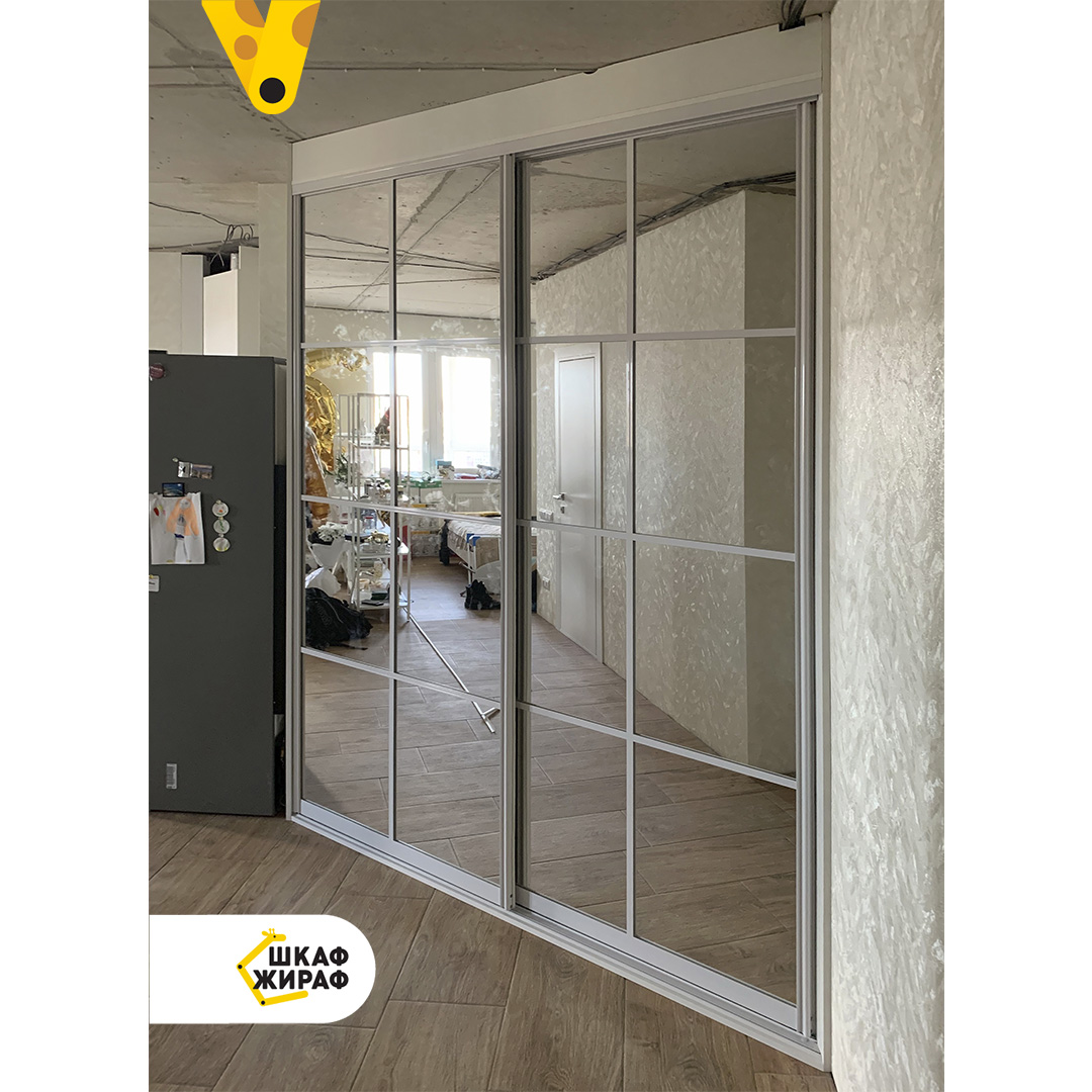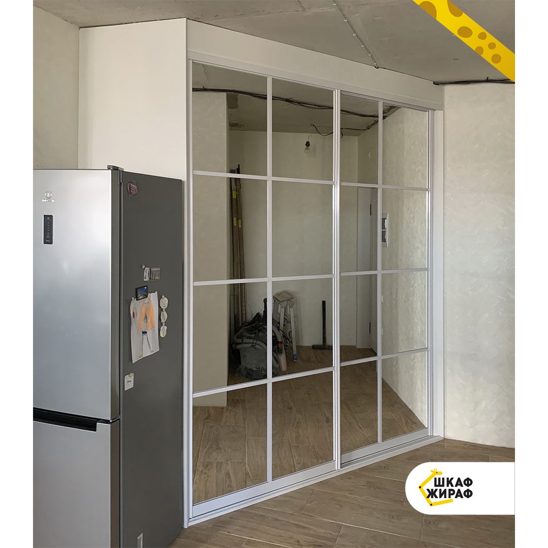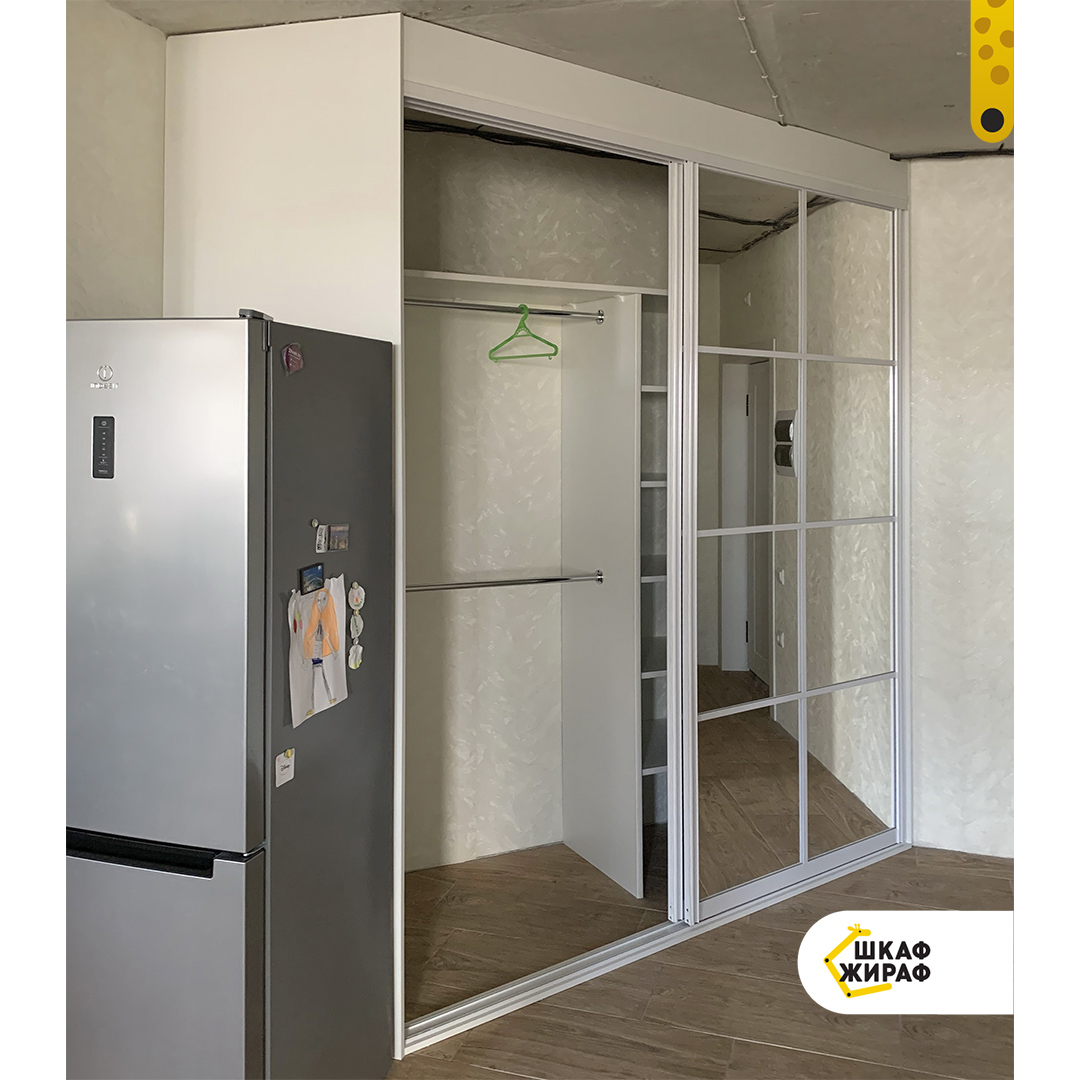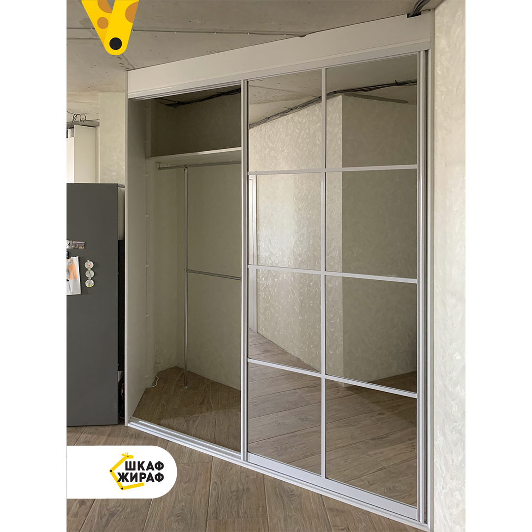 Вверху шкафа — короб под натяжной потолок. Зеркальные двери с разделениями в белом профиле Modus.