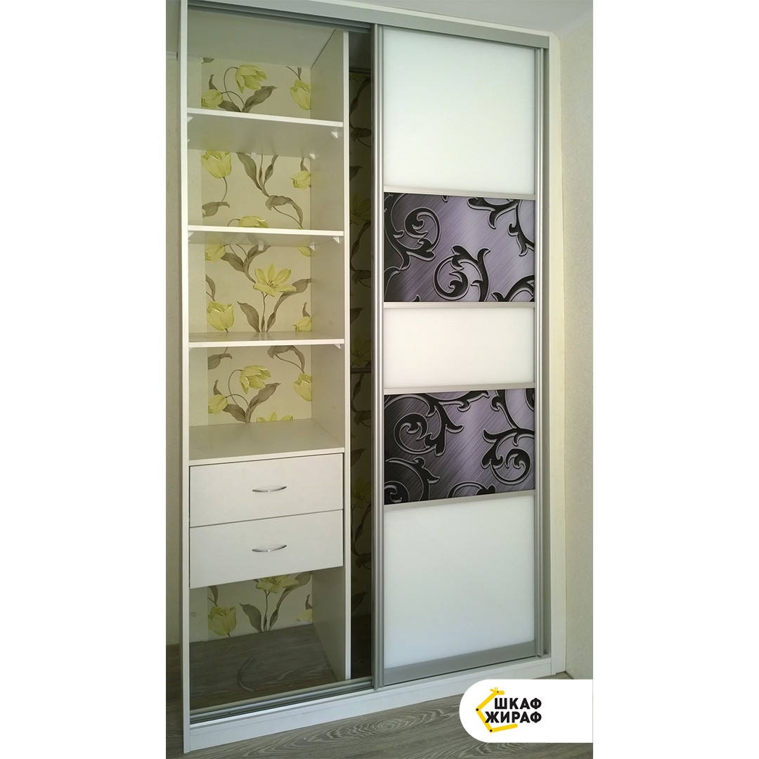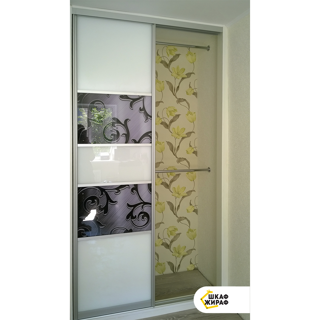 Полувстроенный шкаф-купе с комбинированным фасадом из белого лакобеля и ультрафиолетовой фотопечати.